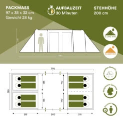 - Außenzelt 320 × 270 × 130 cm / Kabine 210 × 260 cm / Gewicht 6 kg / Farbe grau/schwarz