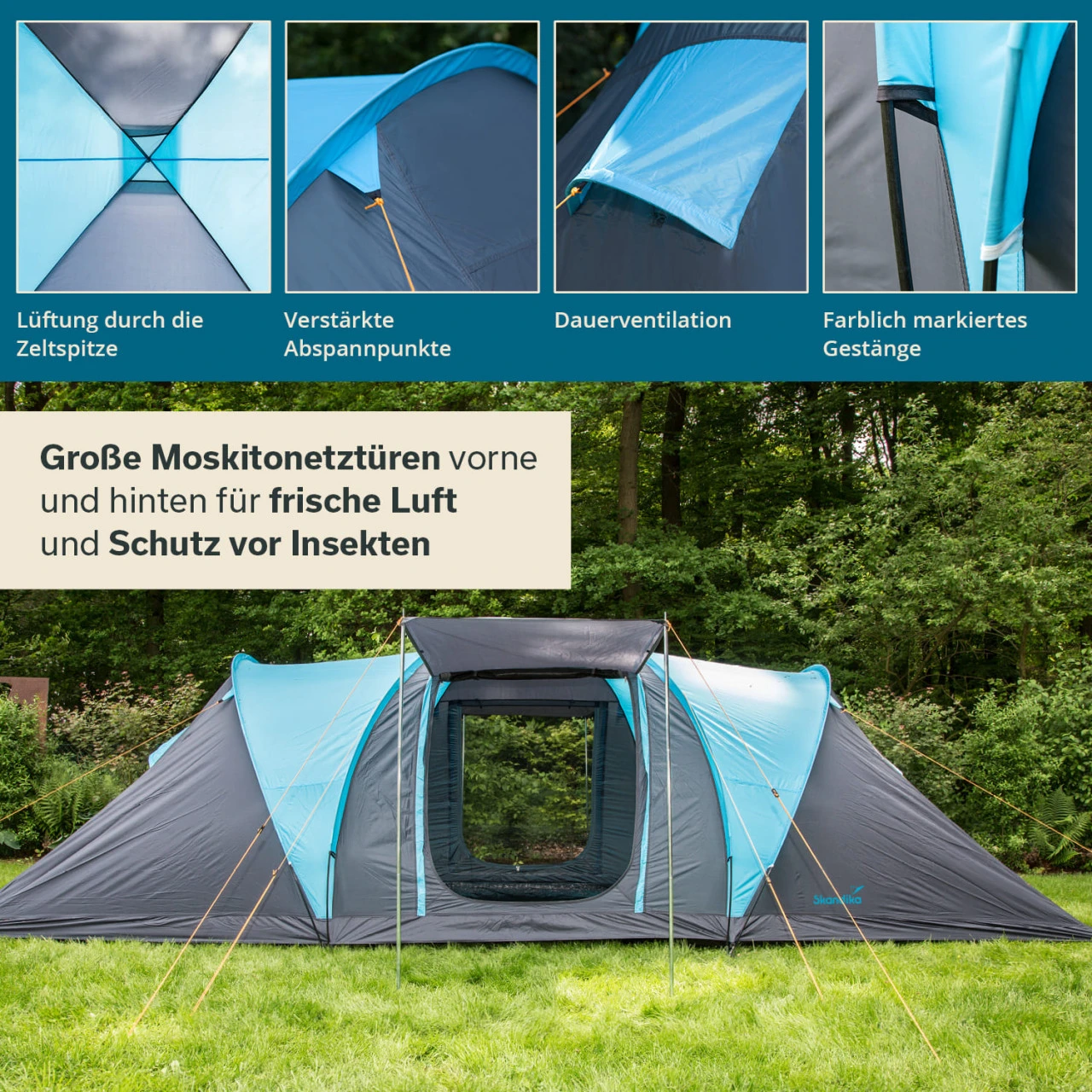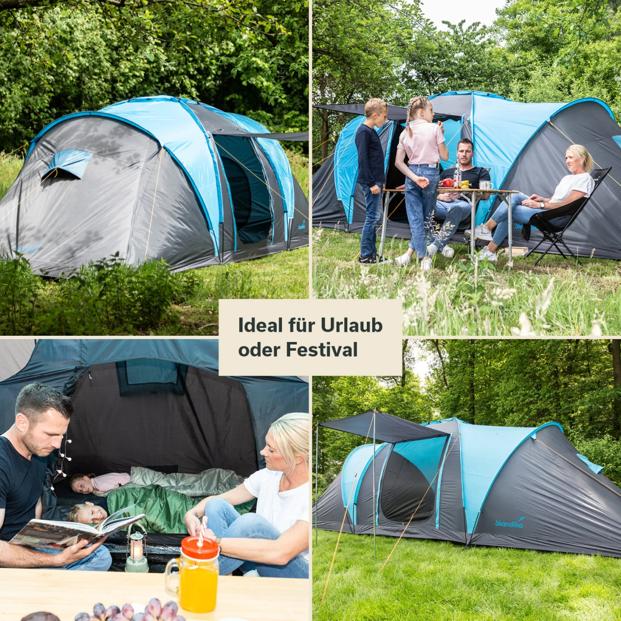 Das Zelt gibt es in drei Ausführungen: Die Basic Variante, die Protect Variante mit eingenähtem Zeltboden und die Sleeper Protect Variante mit eingenähtem Zeltboden und Skandika Sleeper Technologie.