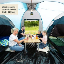 Das Hammerfest 6 ist ein Campingzelt für bis zu 6 Personen mit zwei gegenüberliegenden Schlafkabinen. Die großen Schlafkabinen bieten reichlich Platz für jeweils 3 Personen. Dank der Skandika Sleeper Technologie sind die Schlafkabinen und das Material um die Kabinen herum aus einem Spezialmaterial, das fast vollständig den Lichteinfall verhindert. Somit ist länger schlafen, die Kinder früher ins Bett bringen oder einfach ein kleines Nickerchen machen jederzeit möglich. Zusätzlich zu der normalen Tür der Schlafkabinen besitzt jede Schlafkabine ein Moskitonetz, wodurch die Tür als eine Art Jalousie fungieren kann, um den Grad der Dunkelheit im Schlafraum anzupassen, ohne den Schutz vor zum Beispiel Insekten zu verlieren.