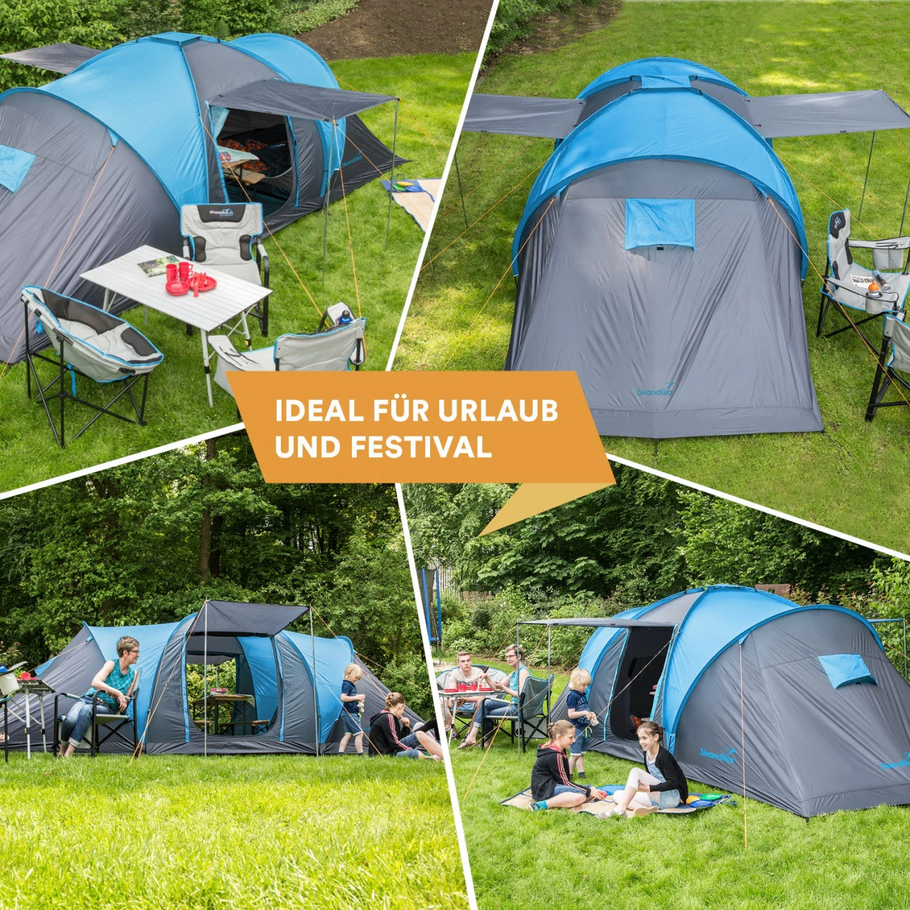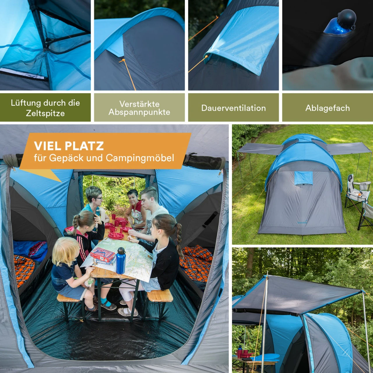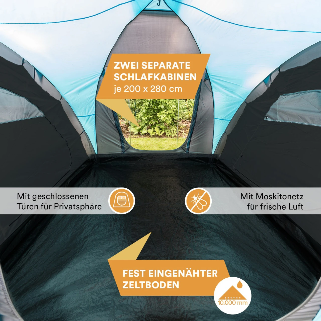 Das schicke Kuppelzelt hat einen fest eingenähten Zeltboden und die Eingänge sind mit Moskitonetz ausgestattet, damit lästige Insekten und Krabbeltiere draußen bleiben. Beide Türen lassen sich mit den mitgelieferten Stahlstangen in ein Sonnendach verwandeln, damit an warmen Tagen eine optimale Ventilation des Wohnbereichs ermöglicht und in den Eingangsbereichen Schatten gespendet wird.