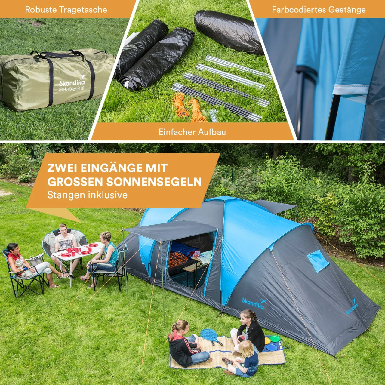 Viele Extras wie ein Haken zur Aufhängung einer Campinglampe, kleine Organizer-Taschen in den Kabinen und wettergeschützte Ventilationsöffnungen für ständige Luftzirkulation selbst bei geschlossenen Türen, machen das Hammerfest zu einem sehr praktischen und komfortablen Zelt, das auch schnell und einfach aufzubauen ist, dank farbig markierten Stangen.