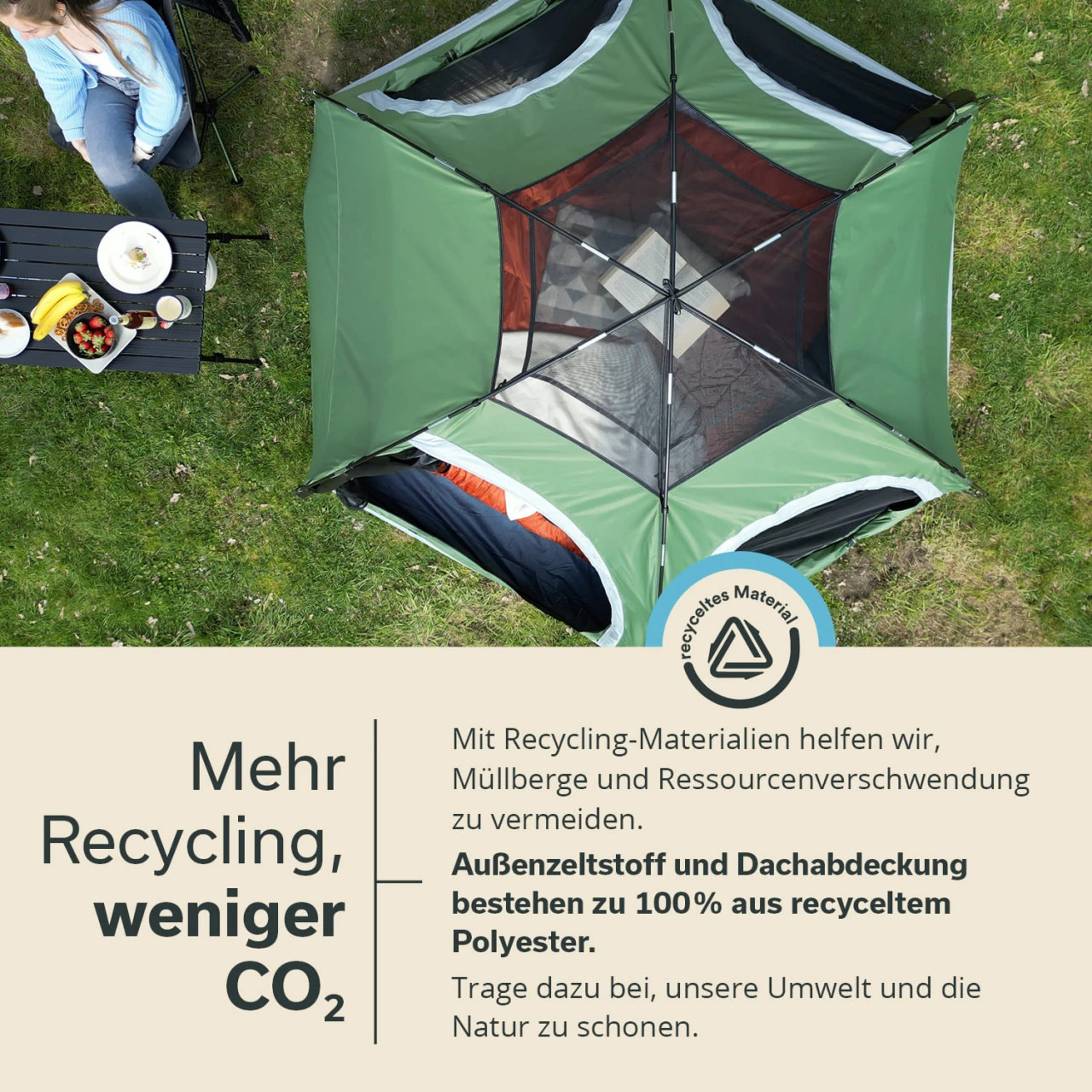 Der Zeltstoff des Außenzeltes besteht zu 100 % aus recyceltem Polyester: aus unserem Verpackungsmüll werden neue Polyesterfasern gesponnen. So helfen wir effektiv Ressourcen wie Erdöl einzusparen und tragen ebenfalls dazu bei, unsere Umwelt und die Natur zu schonen.