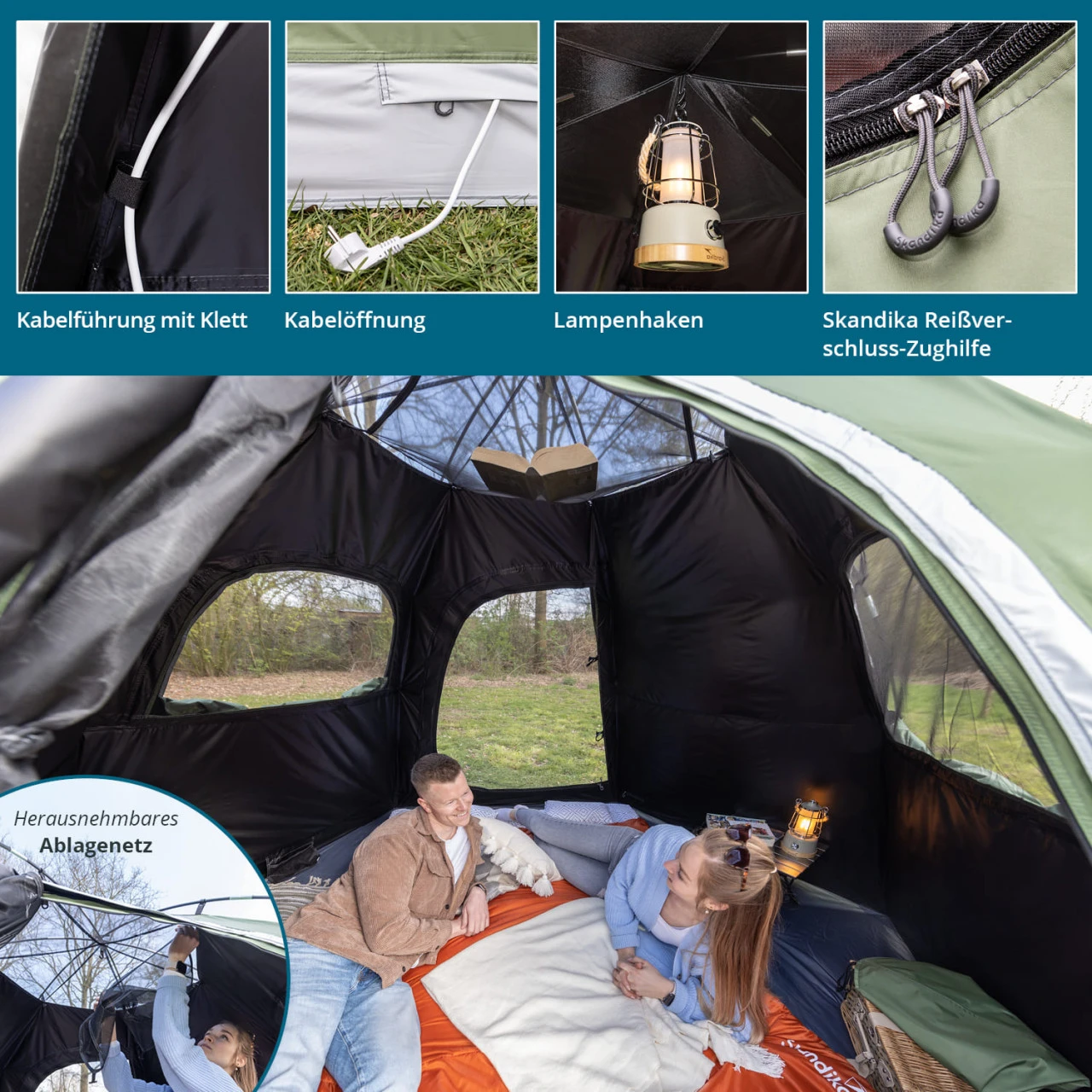 Bei diesem Zelt wurde eine spezielle Beschichtung auf dem Außenzelt aufgetragen, welche fast 100 % des Sonnenlichtes absorbiert. Länger ausschlafen oder mittags ein Nickerchen machen? Alles möglich dank Skandika Sleeper Technology!