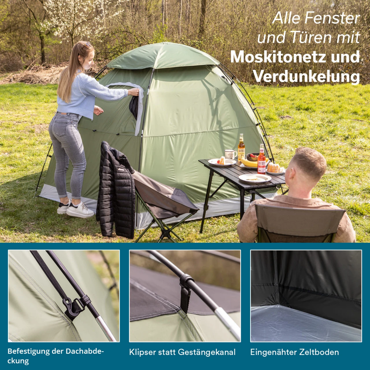 Organizer-Taschen, der Deckenhaken für eine Lampe, eine Kabeldurchführung und die abnehmbare Netzablage unter dem Kuppeldach sorgen für viel Komfort im Campingalltag. Eine robuste Tragetasche erleichtert den Transport und eine staubfreie Aufbewahrung.