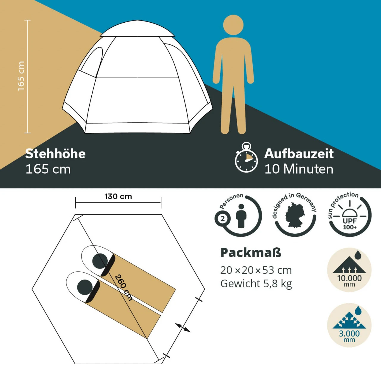 - Großzügiges, 6-eckiges Kuppelzelt mit Platz für 2 Personen, Gepäck und Ausrüstung