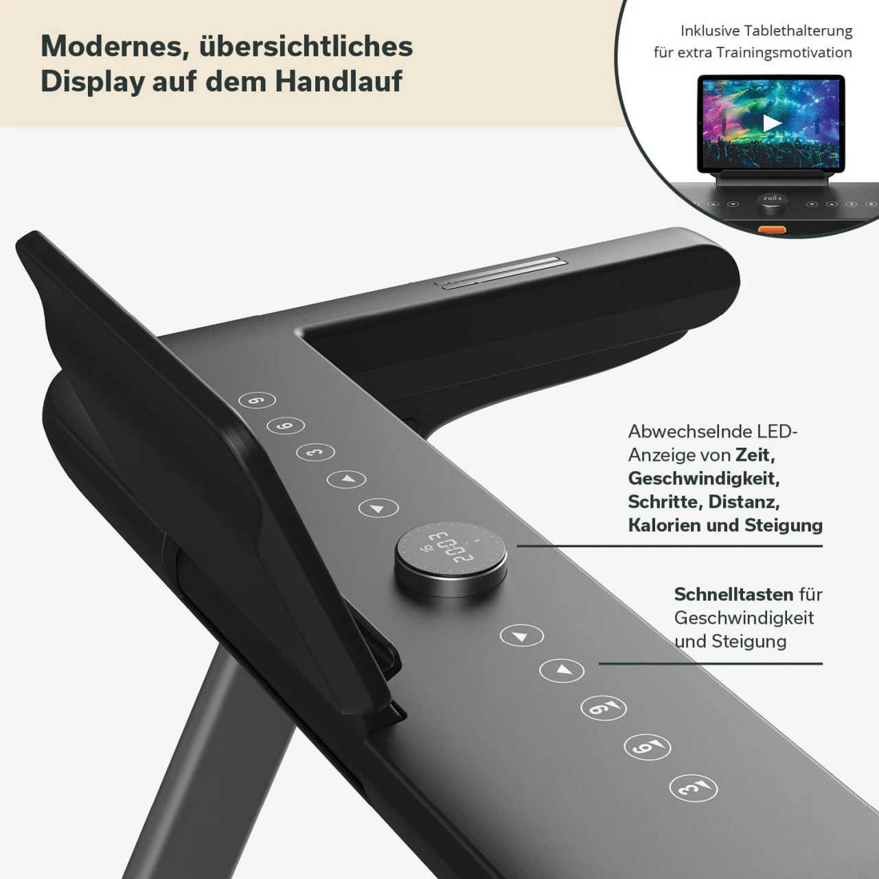 - Leistungsstarkes Laufband mit einer Topgeschwindigkeit von 18 km/h für effektives Training