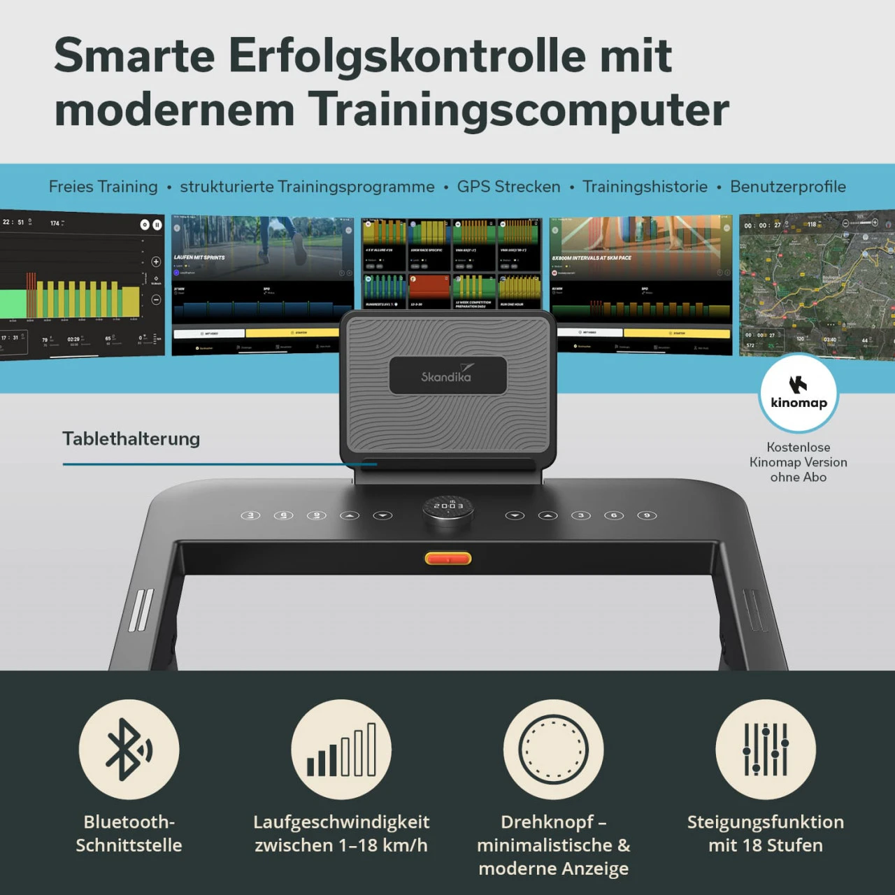 Für eine konstante Überwachung der Herzfrequenz während des Trainings sorgen die Handpulssensoren auf dem Handlauf. Während der Nutzung mit einer Fitness-App, kann zudem über die Bluetooth-Schnittstelle die Übertragung der Herzfrequenz mittels eines Skandika Brustgurtes (optional erhältlich) ebenfalls erfolgen.