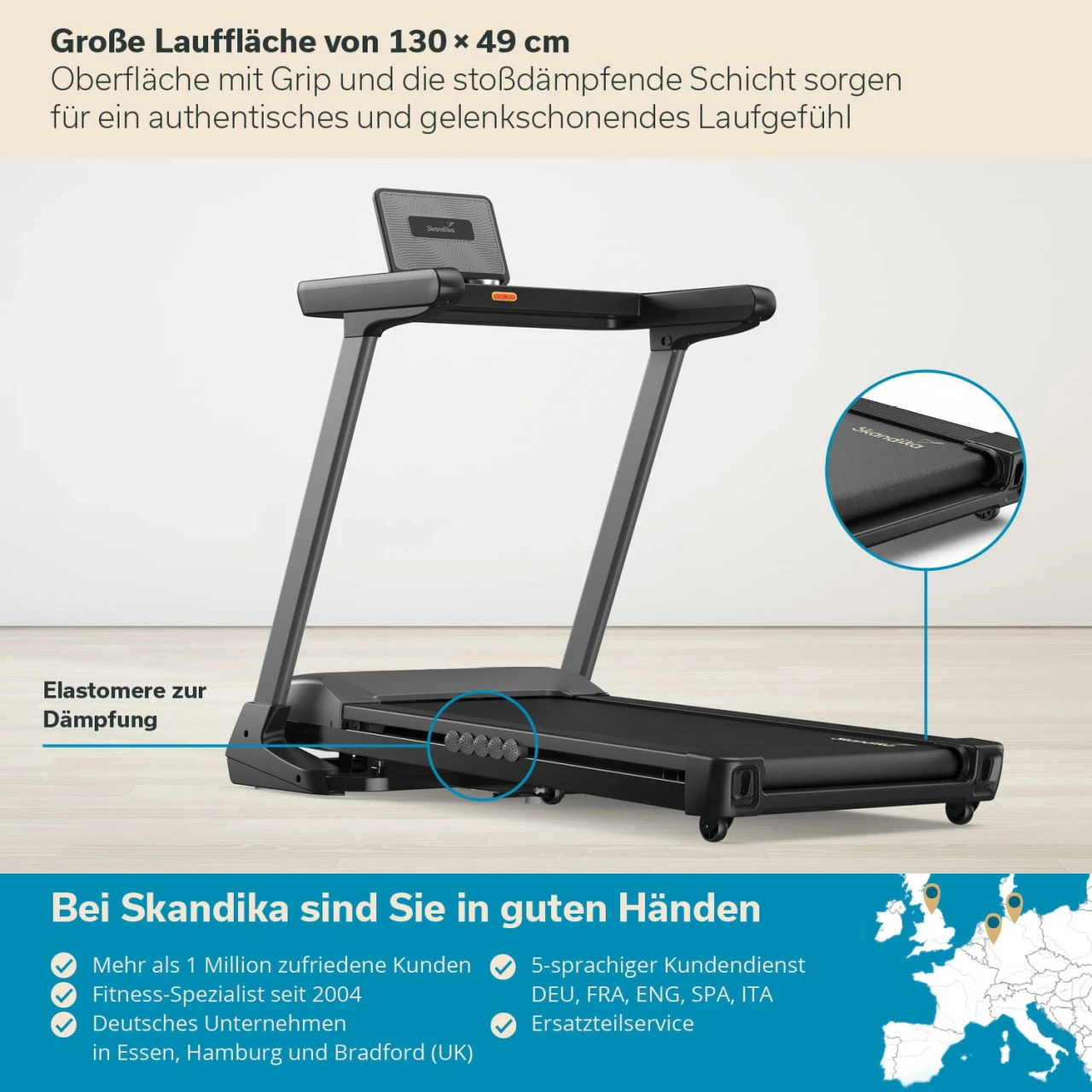 Die großzügige Lauffläche bietet selbst großen Nutzern ausreichend Platz. Die Oberfläche mit Grip, eine zusätzliche, stoßdämpfende Schicht und die seitlich eingebauten Elastomere sorgen für ein authentisches Laufgefühl und gelenkschonende Bewegungen, indem die Schritte abgedämpft und Knie und Füße beim Training nicht unnötig viel belastet werden.