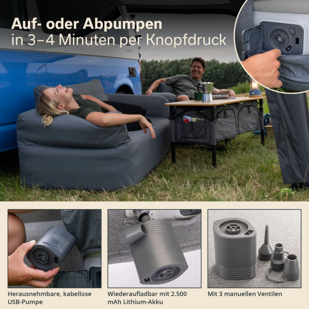 Das Sofa wird komplett mit dem nötigen Zubehör geliefert. Die innovative Pumpe ist in der Rückenlehne integriert, 3 verschiedene Adapter/Ventilaufsätze und ein USB-Ladekabel liegen bei. Eine strapazierfähige Trage- und Aufbewahrungstasche erleichtert den Transport und die Lagerung. Ein Reparatur-Kit und eine Gebrauchsanleitung runden das Angebot ab.