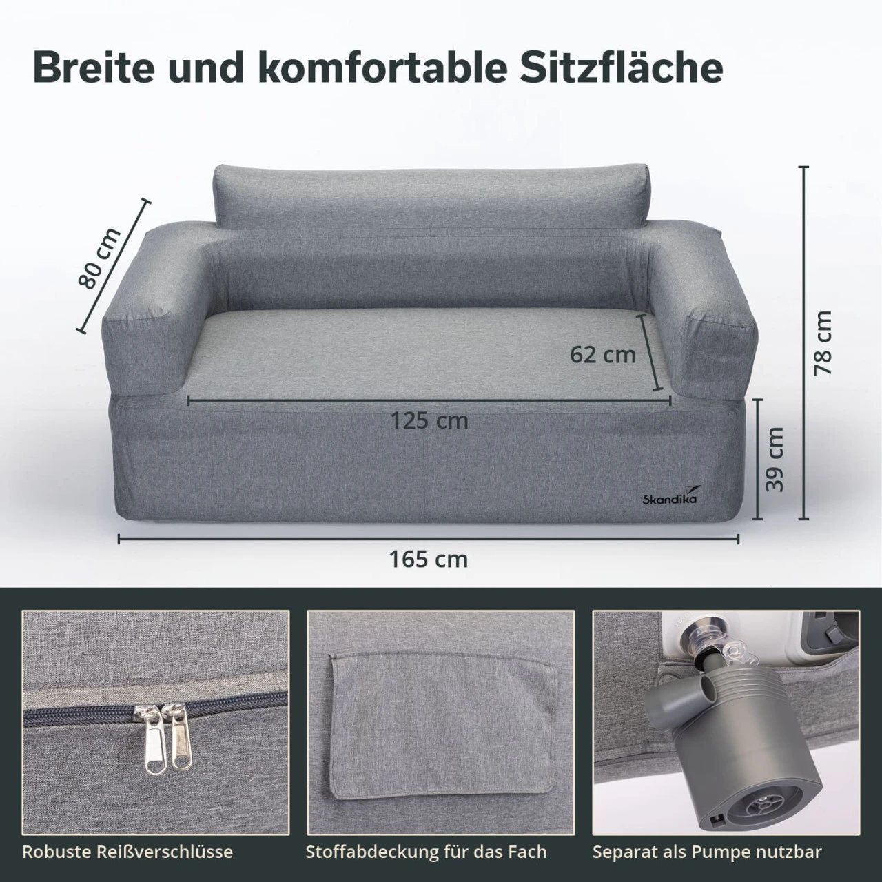 - Sofa 165 × 80 × 78 cm / Sitzfläche 125 × 62 cm / Tragetasche 46 × 60 cm / Gewicht 5,6 kg