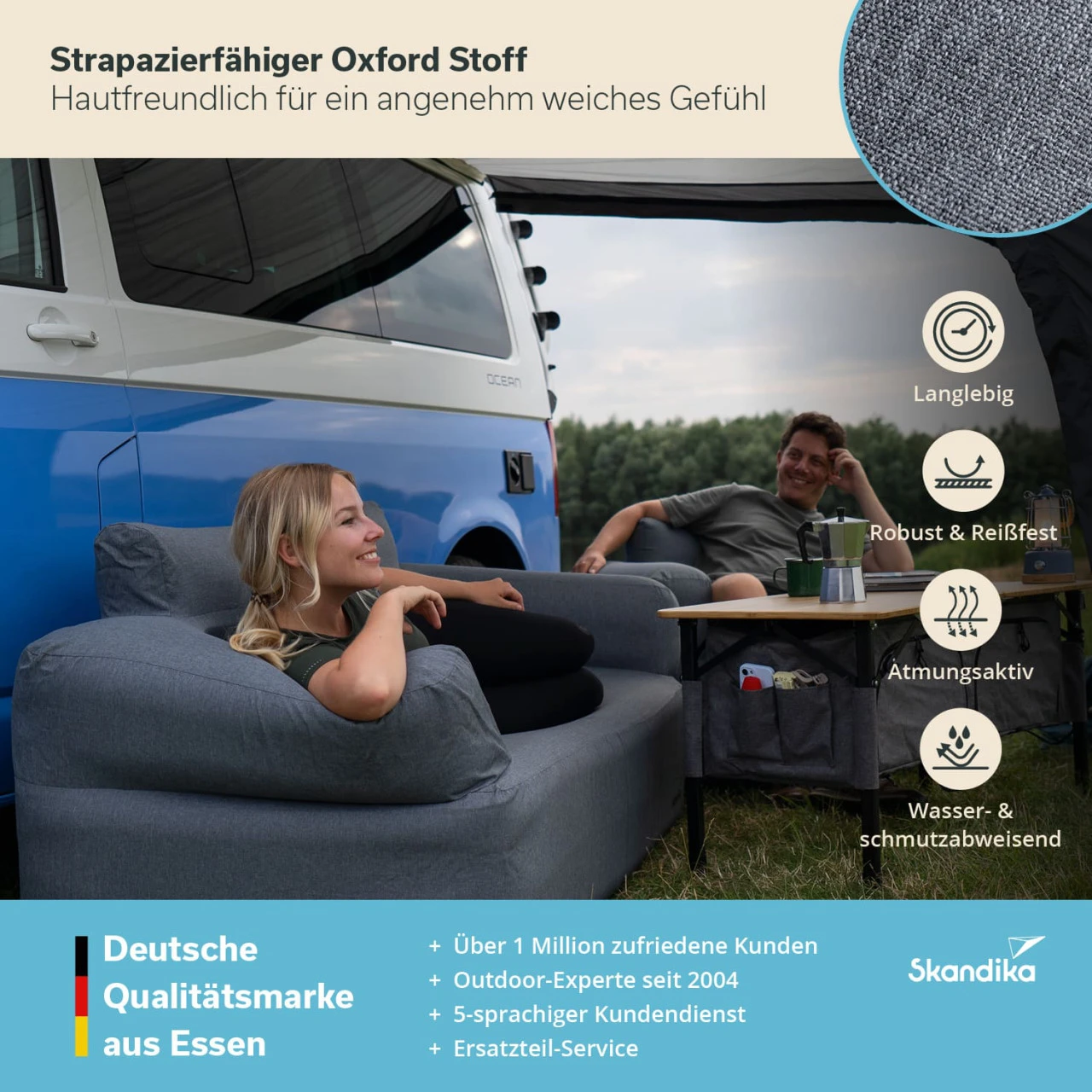 Mit dem schlichten, formschönen Design, der stabilen Zwei-Kammer-Konstruktion und der praktischen Ausstattung mit integrierter Spezialpumpe eignet sich das aufblasbare Camping- Sofa von Skandika nicht nur perfekt für den Innenbereich, sondern ebenfalls für Outdoor-Abenteuer, sei es im Zelt, auf dem Balkon oder im eigenen Garten.