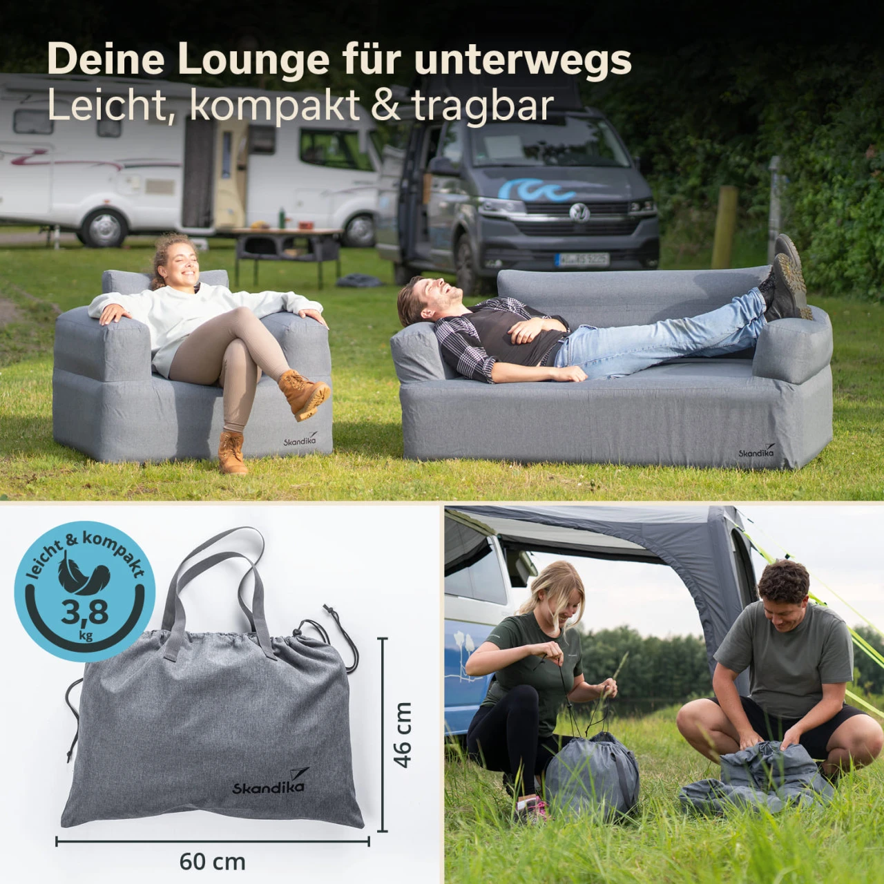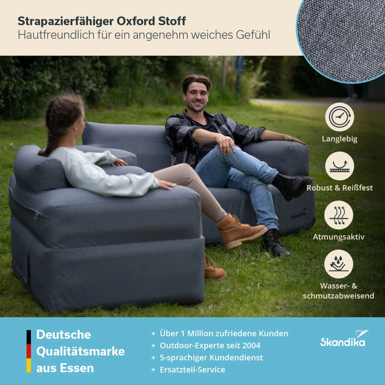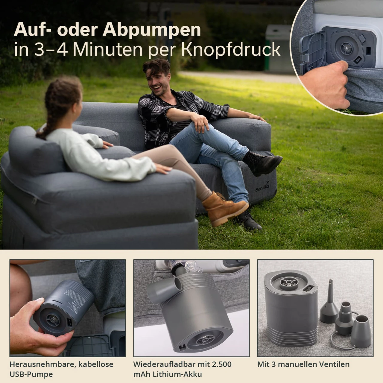 Mit dem schlichten, formschönen Design, der stabilen Zwei-Kammer-Konstruktion und der praktischen Ausstattung mit integrierter Spezialpumpe eignet sich das aufblasbare Camping-Sofa von Skandika nicht nur perfekt für den Innenbereich, sondern ebenfalls für Outdoor-Abenteuer, sei es im Zelt, auf dem Balkon oder im eigenen Garten.