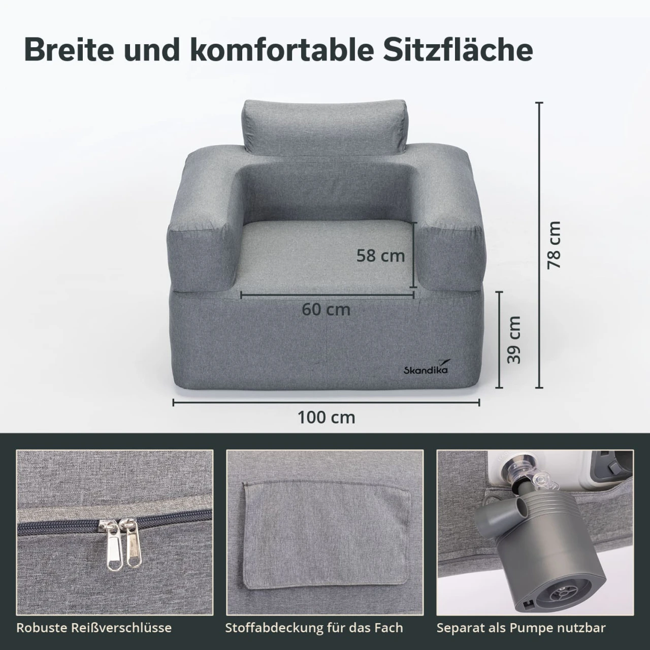 Der Sessel wird komplett mit dem nötigen Zubehör geliefert. Die innovative Pumpe ist in der Rückenlehne integriert, 3 verschiedene Adapter/Ventilaufsätze und ein USB-Ladekabel liegen bei. Eine strapazierfähige Trage- und Aufbewahrungstasche erleichtert den Transport und die Lagerung. Ein Reparatur-Kit und eine Gebrauchsanleitung runden das Angebot ab.