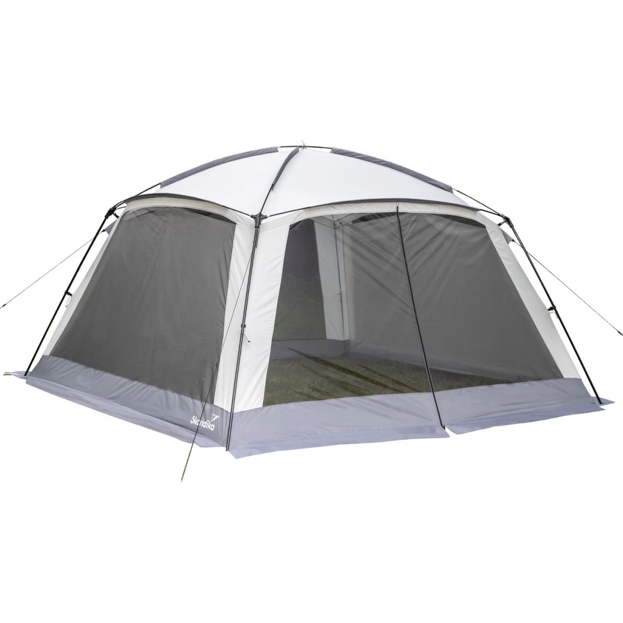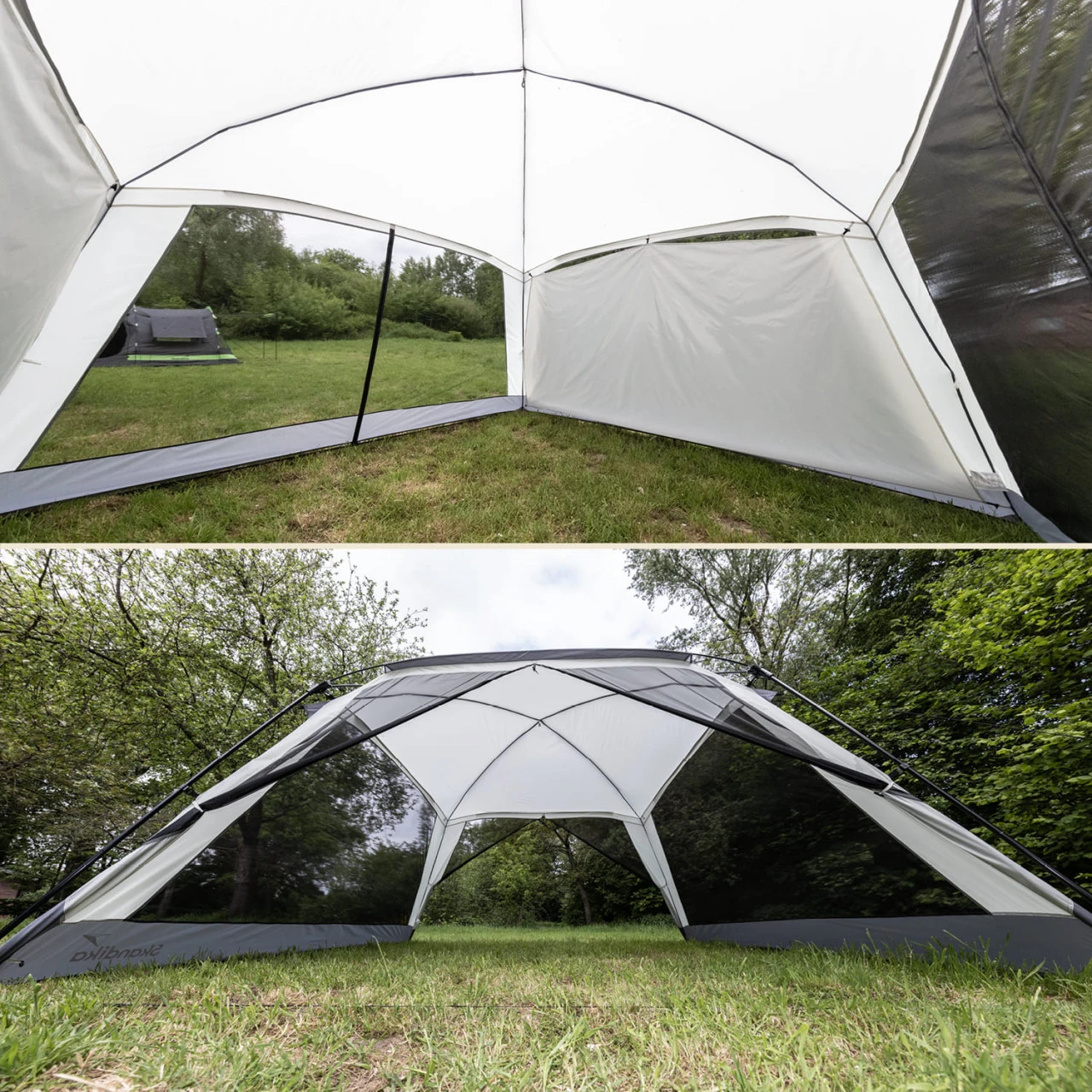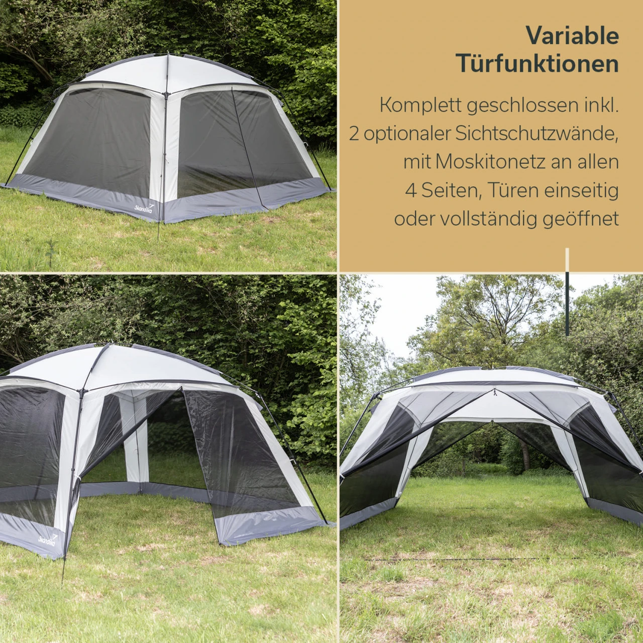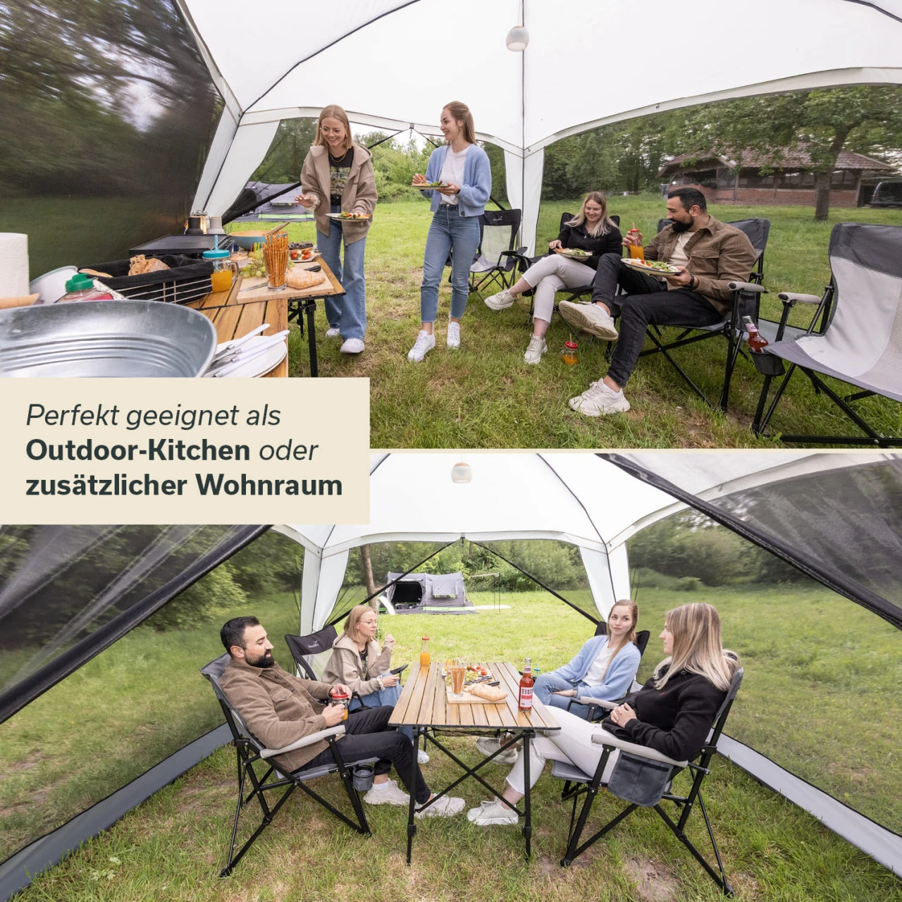In Sachen Komfort und Schutz wird hier nichts dem Zufall überlassen: Das Pavillon-Zelt ist an allen 4 Seitenwänden mit Moskitonetz ausgestattet, die Insekten abwehren und gleichzeitig eine ungehinderte Belüftung ermöglichen. Zwei der sich gegenüberliegenden Wände dienen dank mittig platziertem Reißverschluss als Eingangstüren. Die anderen zwei Seiten können für mehr Privatsphäre mit einem herausnehmbaren Sichtschutz abgedunkelt werden. Eine integrierte Lampenaufhängung sorgt für ein angenehmes Licht und gemütliche Abende im Zelt.