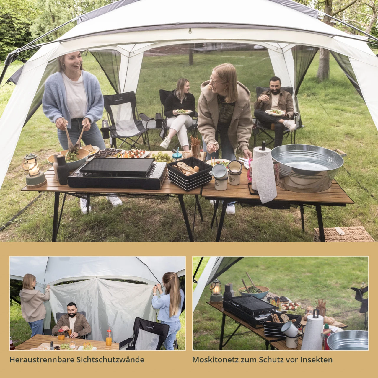 Der schnelle und einfache Aufbau macht den Pavillon zur idealen Wahl für Situationen, die einen schnellen Einsatz erfordern, wie bei Campingausflügen, Gartenpartys oder Festivalbesuchen.