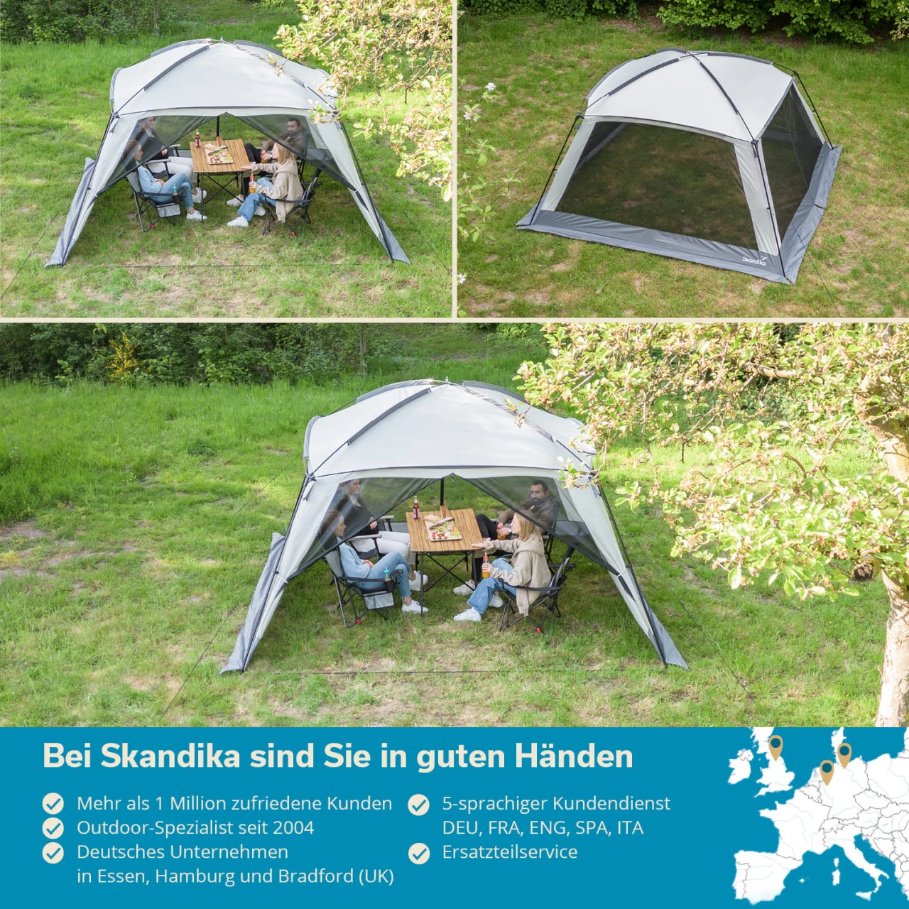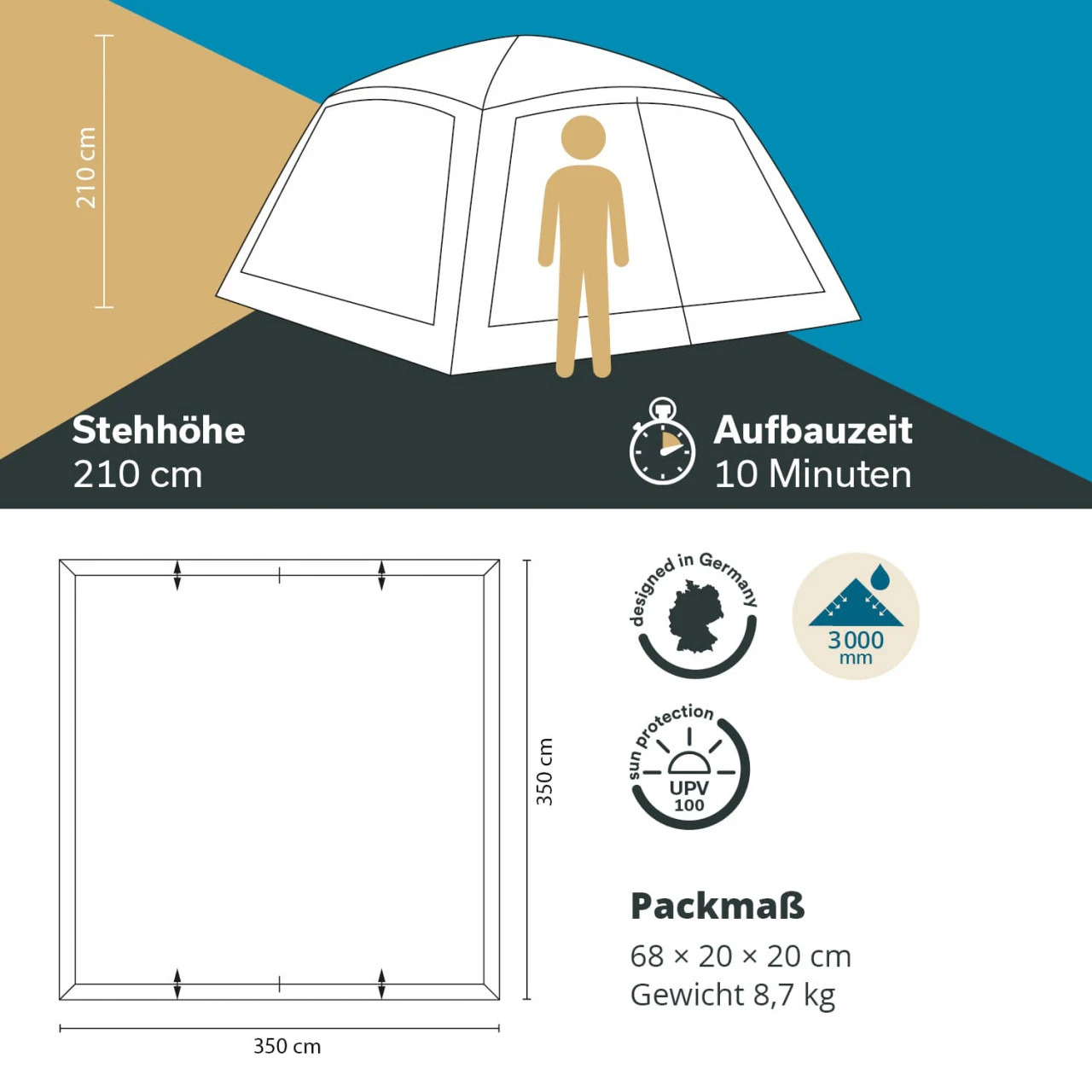 Das Skandika Pavillon Fortun stellt sich als zuverlässiger Outdoor-Begleiter für vielfältige Anlässe dar – sei es beim Camping, im Garten oder auf einem Festival. Es bietet mit seinen großzügigen Maßen von 350 x 350 cm und einer Stehhöhe von 210 cm viel Raum für verschiedenste Aktivitäten oder zum gemütlichen Entspannen mit Familie und Freunden.
