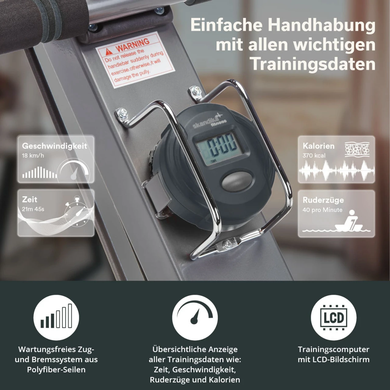 - LCD-Display für Trainingszeit, Anzahl der Züge, Geschwindigkeit und Kalorien