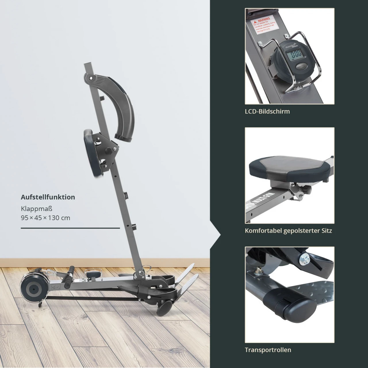 So mini geht multi: Das Skandika Multi Gym Poseidon bringt lediglich 17 kg auf die Waage und lässt sich dank Klappmechanik auf 95 x 45 x 130 cm (L x B x H) komprimieren! Aufgebaut misst das Rudergerät 190 x 45 x 65 cm. Praktisch: Der vordere Fuß verfügt über integrierte Rollen für einfaches Anheben und Wegrollen. Während des Trainings bleibt das kompakte Poseidon auch bei hoher Intensität absolut standhaft.