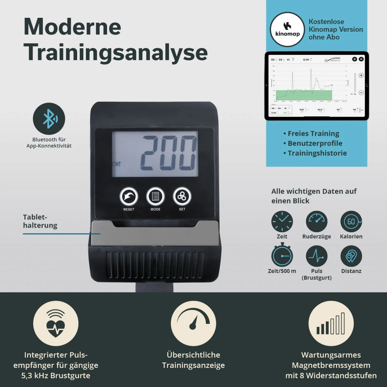 - Display-Anzeige: Ruderschläge, Distanz, Puls, Zeit, Kalorien