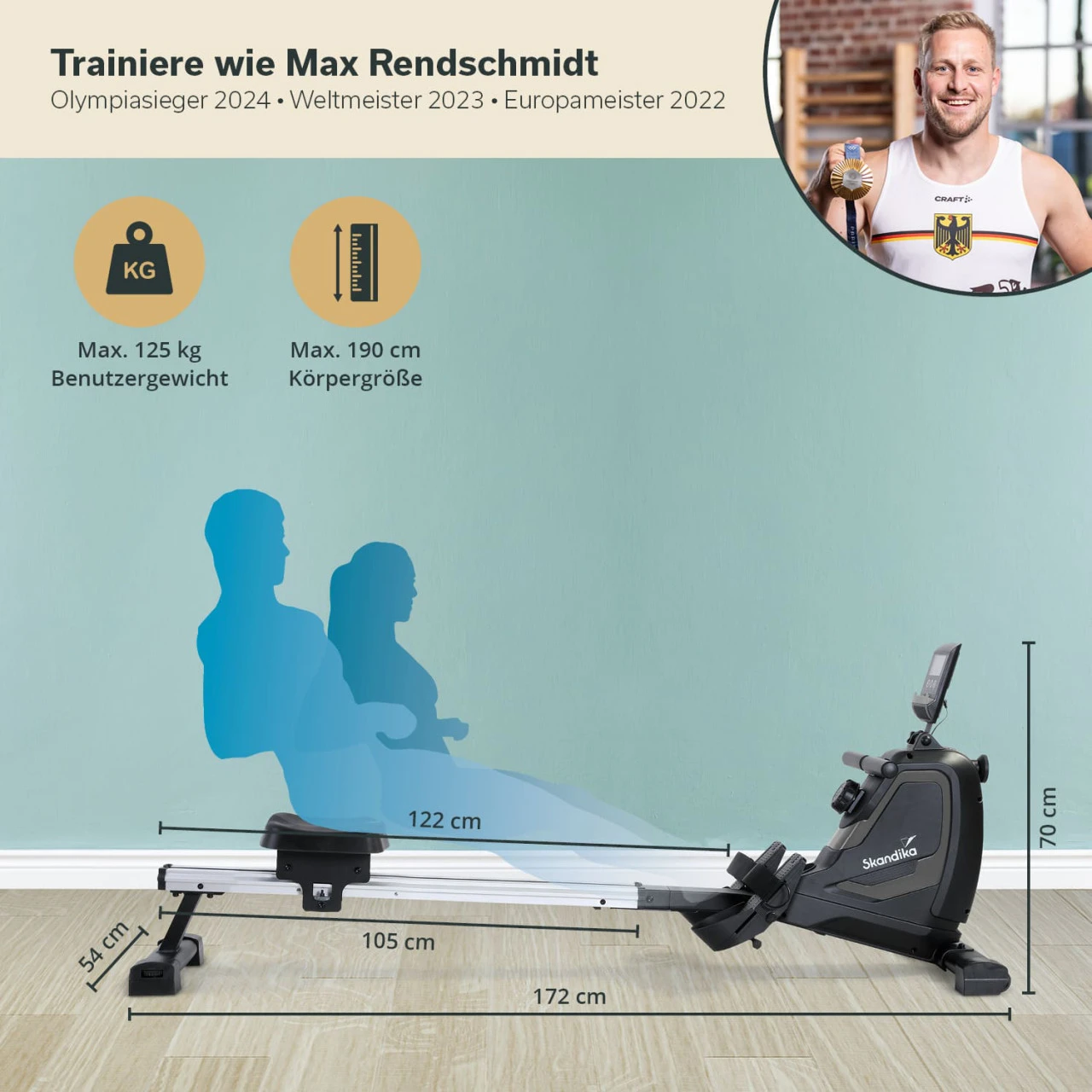 Die stabile und hochwertige Konstruktion ermöglicht ein komfortables Training mit einer Körpergröße von 155 bis 190 cm und bis zu einem maximalen Benutzergewicht von 125 kg. Die Maße des Rudergeräts betragen 174 × 55 × 65 cm.