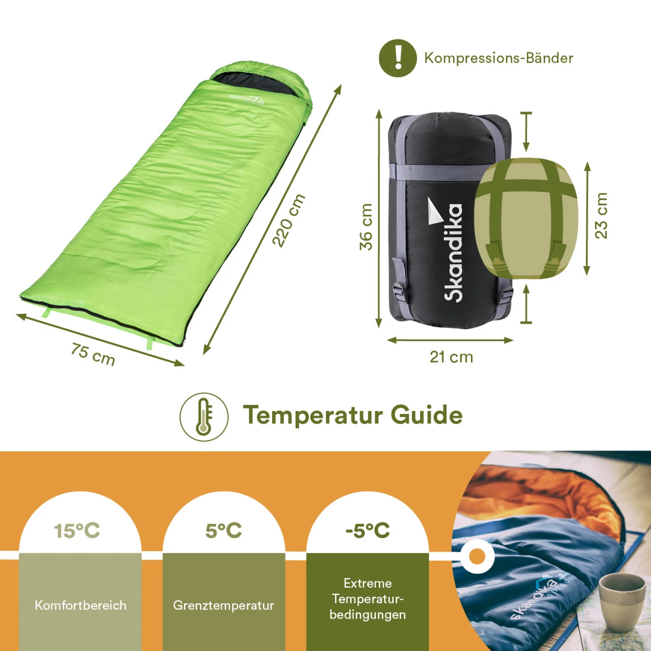 Melt, Hurricane, Deichbrand – der Schlafsack Skye von Skandika macht jedes Festival mit. Mit seiner wasserabweisenden Polyester-Oberfläche hält er der feucht-fröhlichen Umgebung stand und sorgt dank weicher Mikrofaserfüllung für einen gemütlichen Schlafkomfort. Auch auf Partys bei Freunden ist der Skye schnell ausgepackt und bei Bedarf mit einem Partnerschlafsack zusammengezippt (dazu bitte beim Kauf auf rechte und linke Reißverschluss-Variante achten). Wer es weniger beengt mag, öffnet den Reißverschluss komplett und hat so eine luftige Decke. Auch für den schnellen Rückzug ist gesorgt: Den Schlafsack einfach in den Kompressionssack stopfen und fertig. Der Skye ist klein, leicht und handlich zu verstauen und ist mit einer Komforttemperatur von 15° C auch der perfekte Schlafsack für einen Urlaub in gemäßigten Zonen. Lediglich bei Regenschlachten wie alljährlich in Wacken könnte er an seine Grenzen kommen.