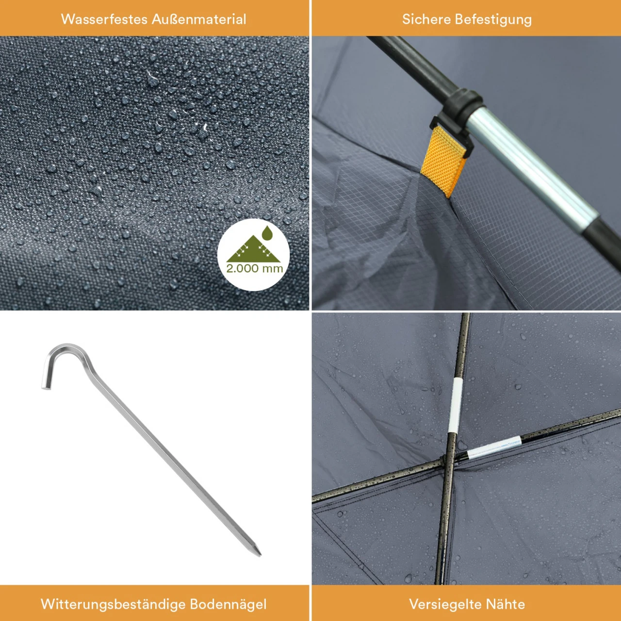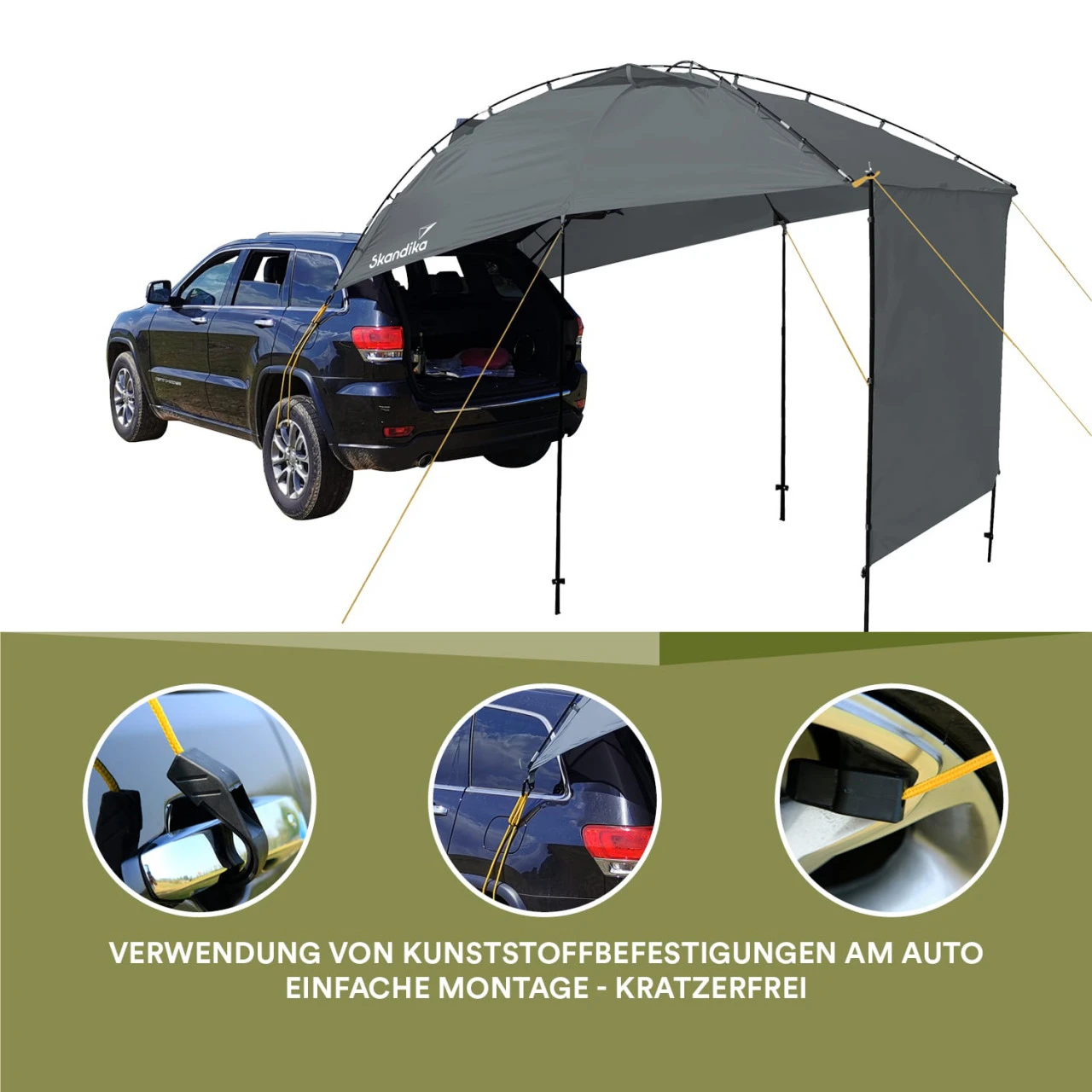 Das Dachteil des Sonnensegels wird mit drei bruchsicheren Fiberglasstangen stabilisiert, damit eine leichte Kuppelform entsteht. Die vier Aufstellstangen sind aus Stahl und werden mit den Abspannleinen fixiert. Die Befestigung des Segels am Auto erfolgt kinderleicht mit den zwei Gummispanngurten, die mit lackschonenden Kunststoffhaken versehen sind: einfach an Felgen, Türgriffen oder Dachreling usw. einhaken.