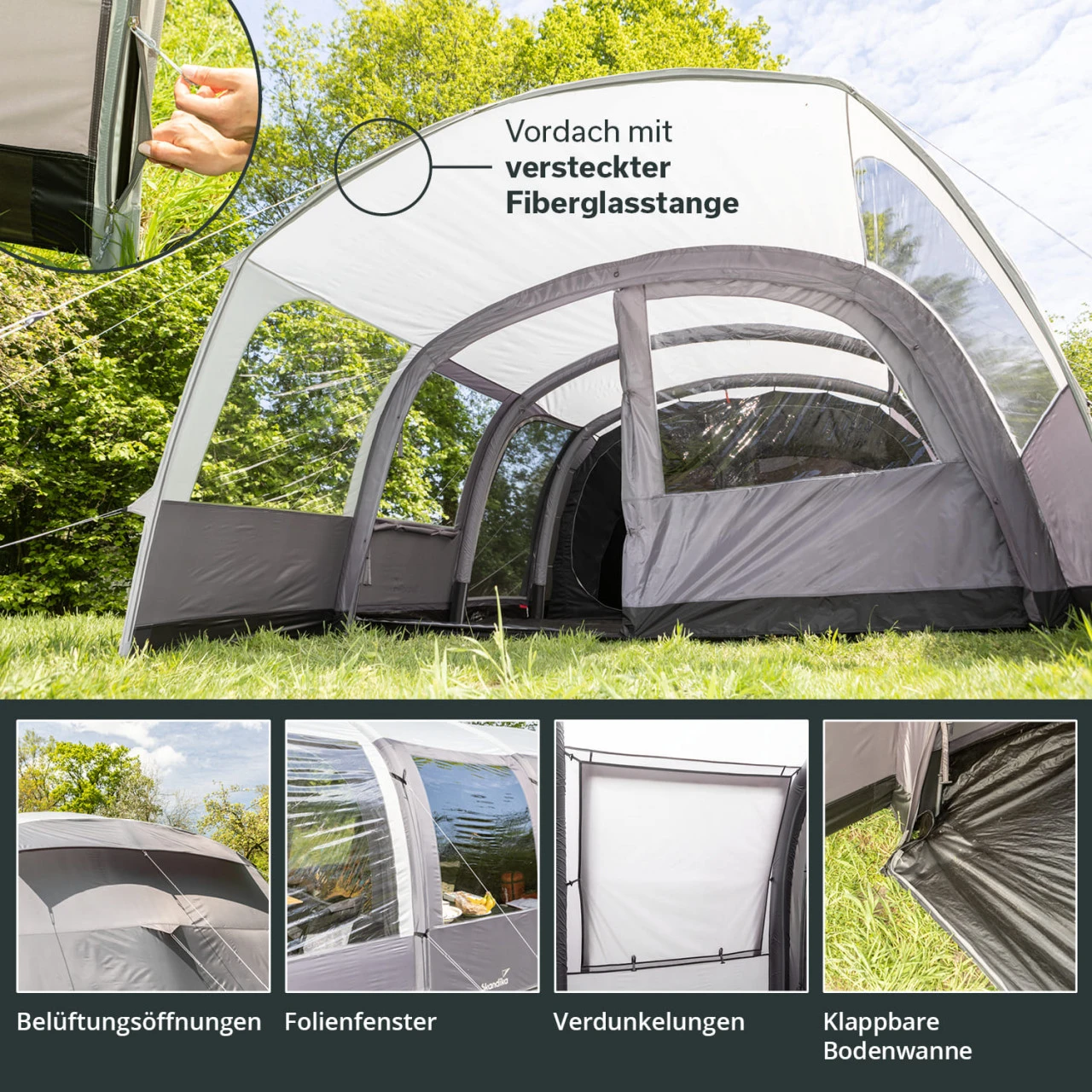 - 2 seitliche Panoramafenster aus Folie, mit Sichtschutz/Verdunkelung