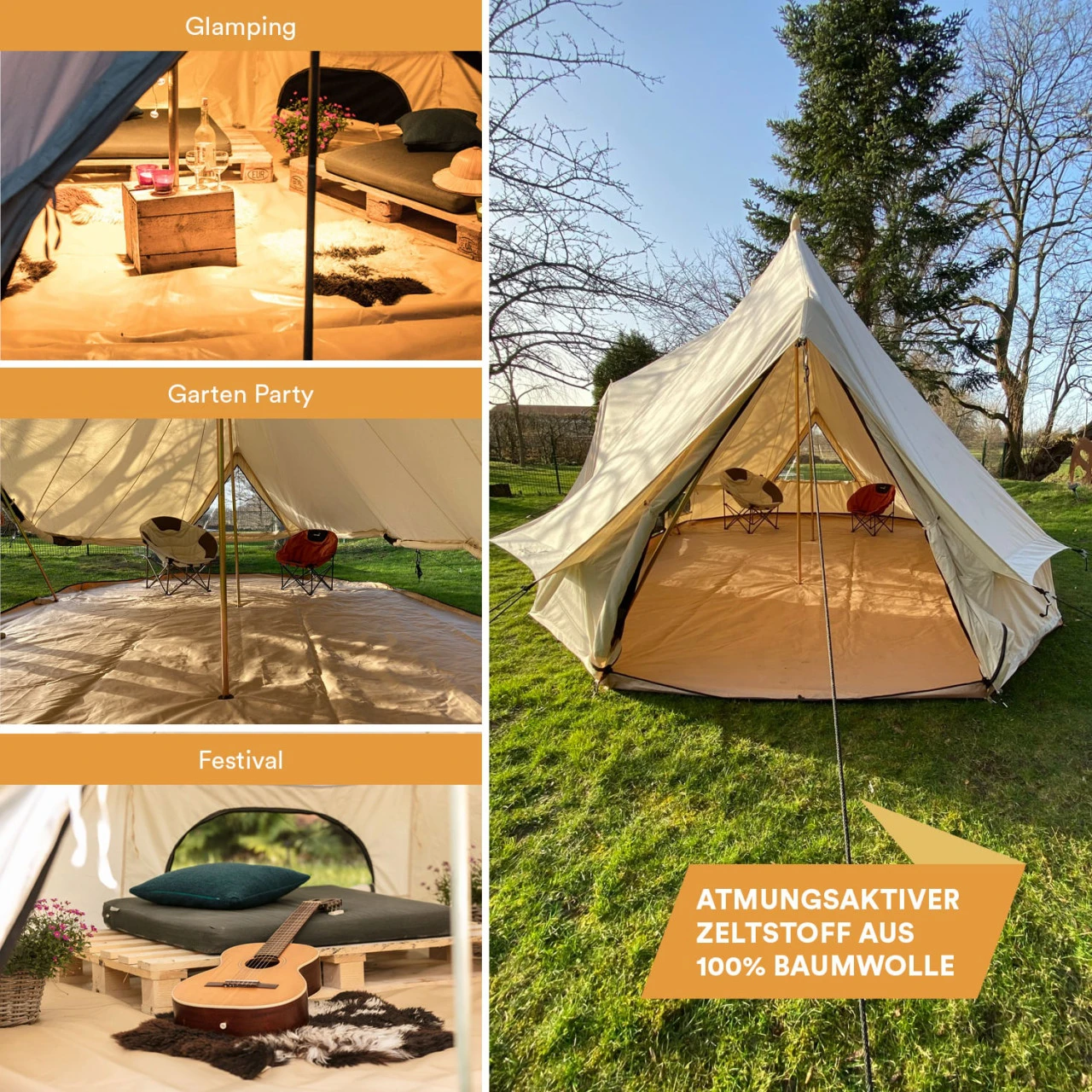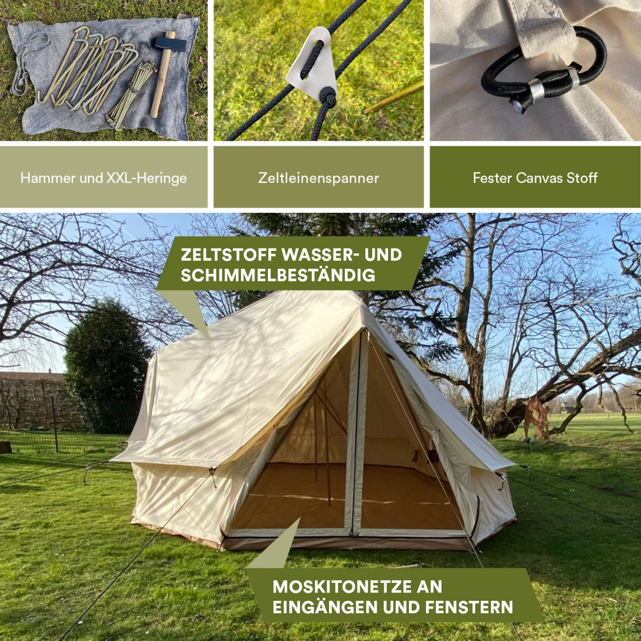 - Das Außenzelt besteht zu 100 % aus echter, atmungsaktiver Baumwolle