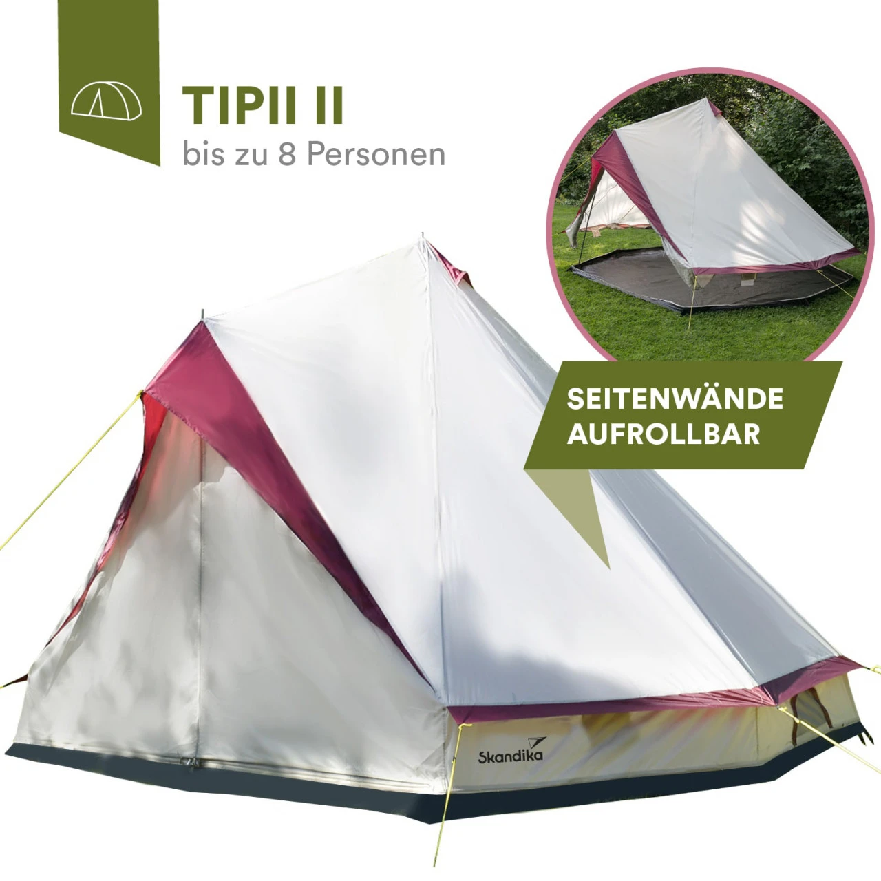 Im Skandika Tipii II können bis zu 8 Personen ihren Schlafsack ausbreiten und bequem übernachten. Der Gesamtdurchmesser von 4 m und die besondere Höhe von 2,5 m lässt das Zelt selbst bei so vielen Menschen noch geräumig und luftig erscheinen.