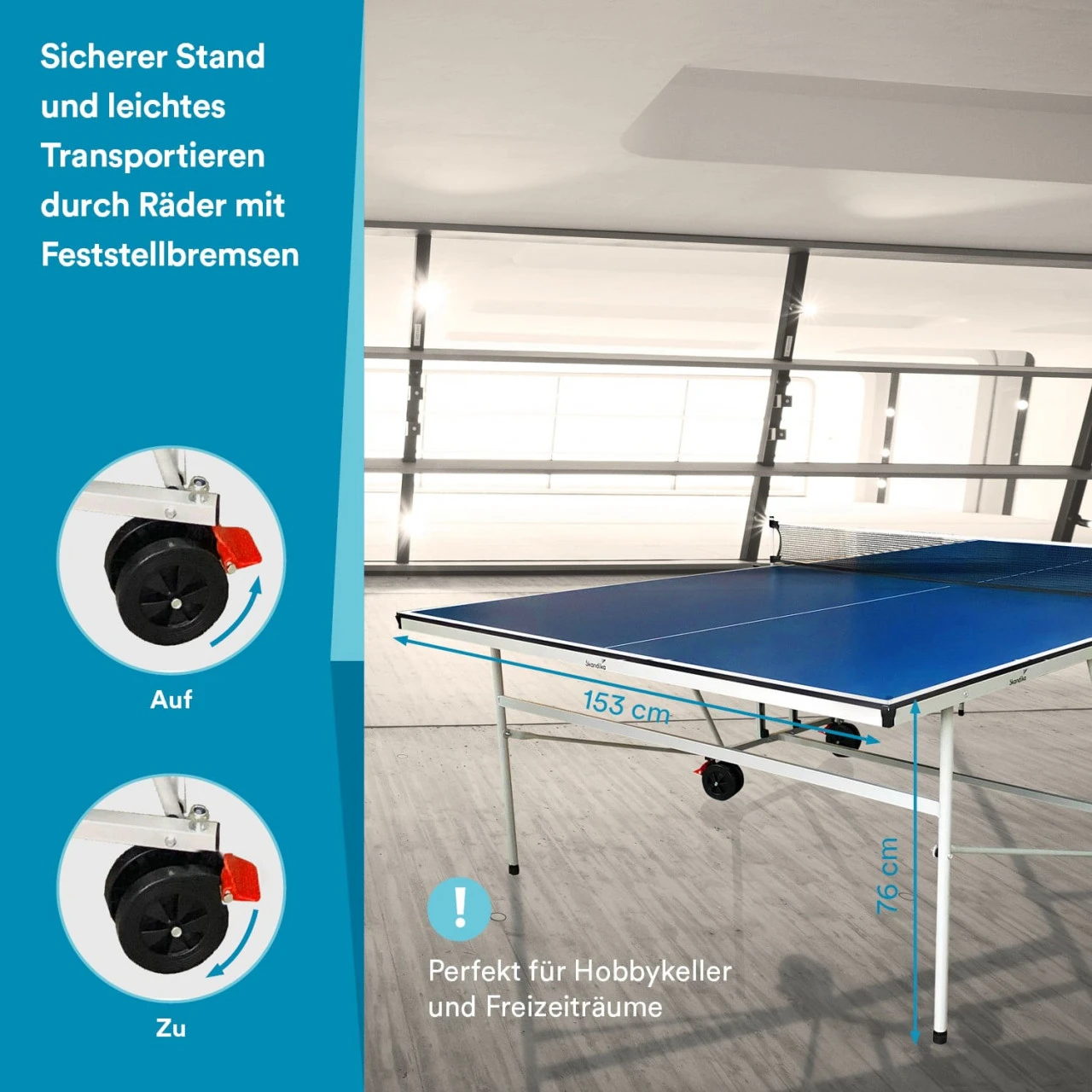 Die Tischtennisplatte mit den Aufbaumaßen 274 x 153 x 76 cm eignet sich perfekt für spannendes und spaßiges Spielen in den eigenen 4 Wänden.