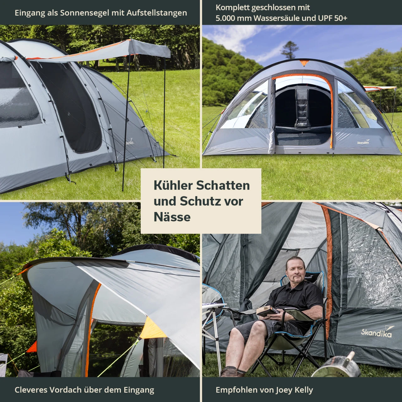 Die robusten Fiberglasstangen sorgen für einen sicheren Stand selbst bei starkem Wind und die hohe Wassersäule des PU-beschichteten Materials des Außenzeltes von 5.000 mm und die sorgfältig versiegelten Nähte bieten Sicherheit und Komfort, auch bei Sturm und starkem Regen.