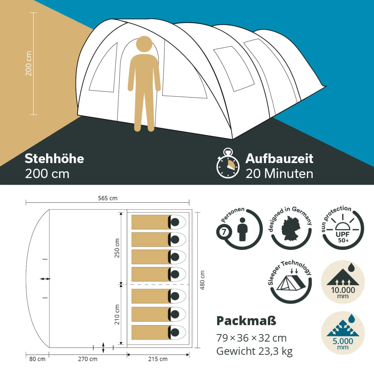 Geräumiges Tunnelzelt für 7 Personen mit noch größerem Wohnraum für das kleine Extra an Komfort. Im Nu aufgestellt und mit einer bequemen Stehhöhe von 200 cm ermöglicht das Zelt tolle Outdoor-Abenteuer für Familien mit Kindern oder Gruppen von Freunden.