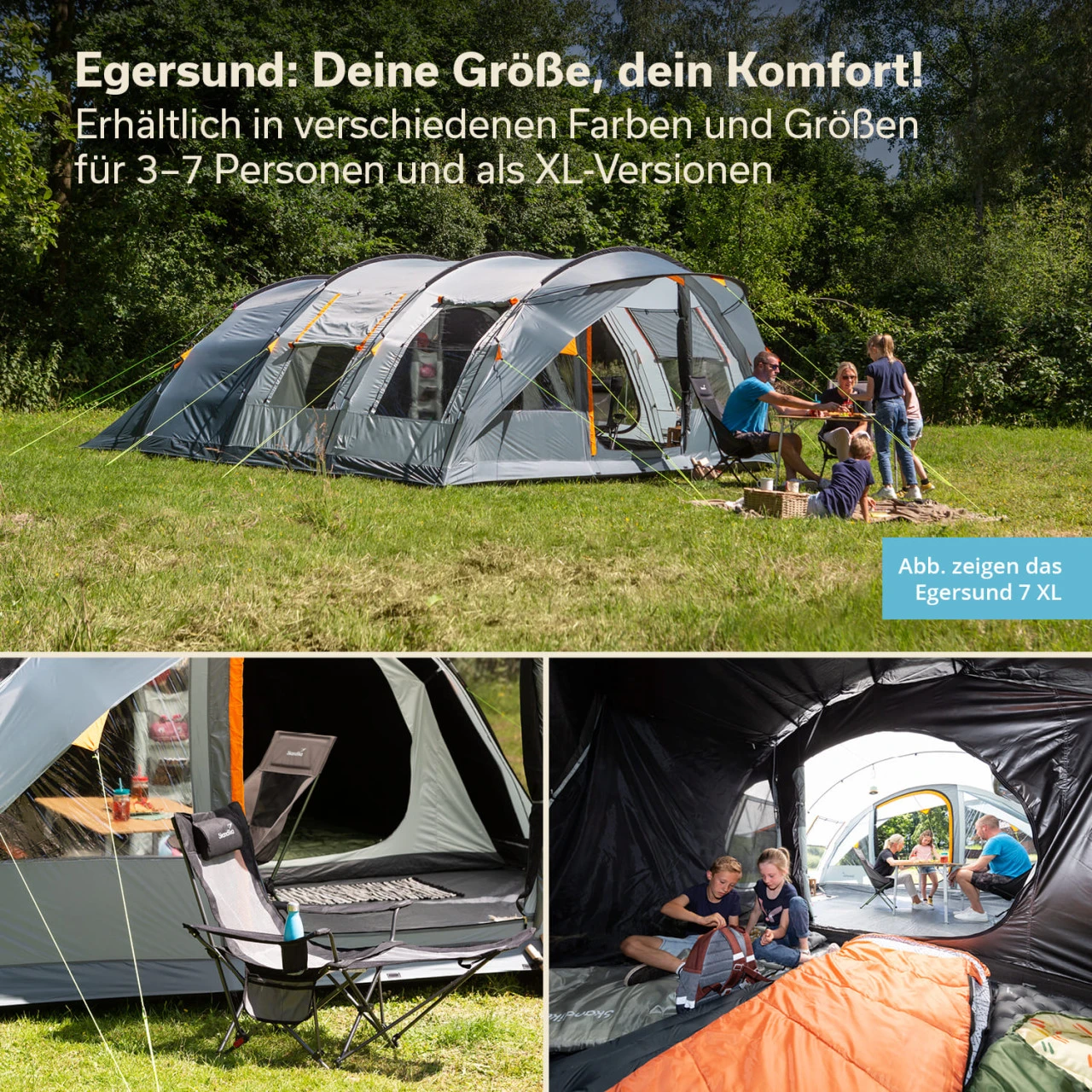 Unsere beliebten Egersund Zelte mit fest eingenähtem Zeltboden haben wir nun um eine etwas größere Version mit der Skandika Sleeper Technologie, einer speziellen Beschichtung des Außenzeltes, und abgedunkelten Innenkabinen erweitert. Das standsichere, wetterfeste Zelt ist eine exzellente Wahl für Familien, die mit Kindern zelten oder wenn Freunde zusammen unterwegs sind, die Komfort und ruhige Nächte schätzen.