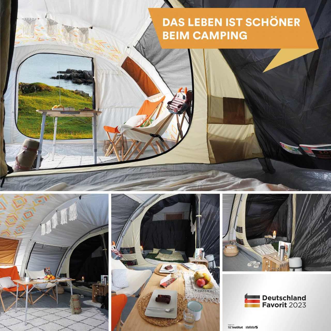 Dieses großzügige Zelt bietet über 24 m² mit fest eingenähtem Zeltboden bei einer durchaus bequemen Stehhöhe von 210 cm. Es ermöglicht somit fantastische Outdoor-Abenteuer für Familien und Freunde, die schnell und unproblematisch ihr Urlaubsquartier aufstellen möchten.