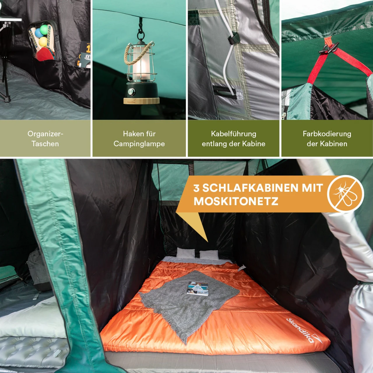 Das Skandika Montana 8 bietet viel Bewegungsfreiheit und die fast senkrechten Seitenwände erlauben eine komplette Ausnutzung der Bodenfläche. Perfekt für den Urlaub mit der ganzen Familie oder mit Freunden.