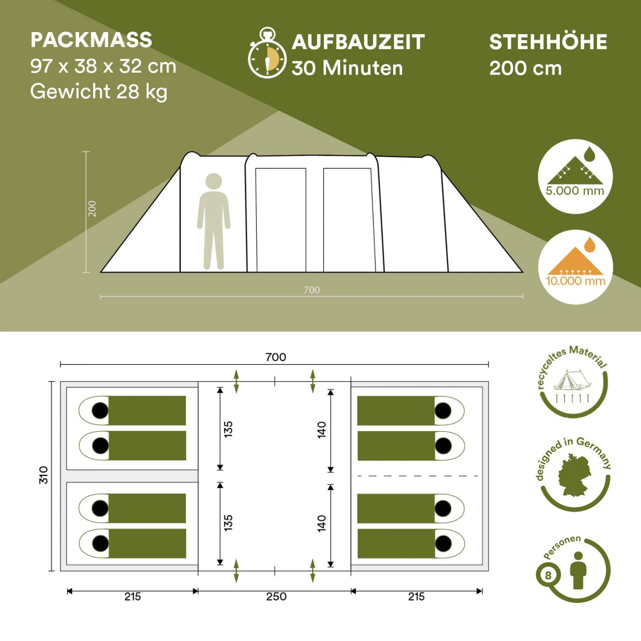 Über 21 m² bietet das große Zelt, bei einer bequemen Stehhöhe von 200 cm, und ermöglicht somit fantastische Outdoor-Abenteuer für größere Familien und Gruppen von bis zu 8 Personen, die nicht auf viel Platz und Bewegungsfreiheit verzichten möchten.