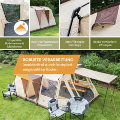 - Viele praktische Extras wie ein Haken für Campinglampen, Kabeldurchführung und Organizer-Taschen