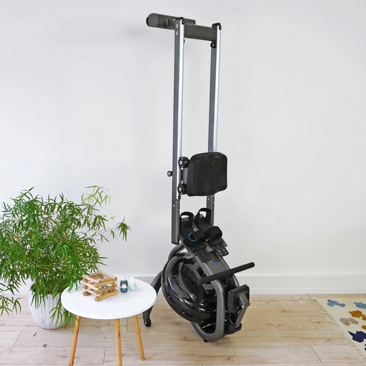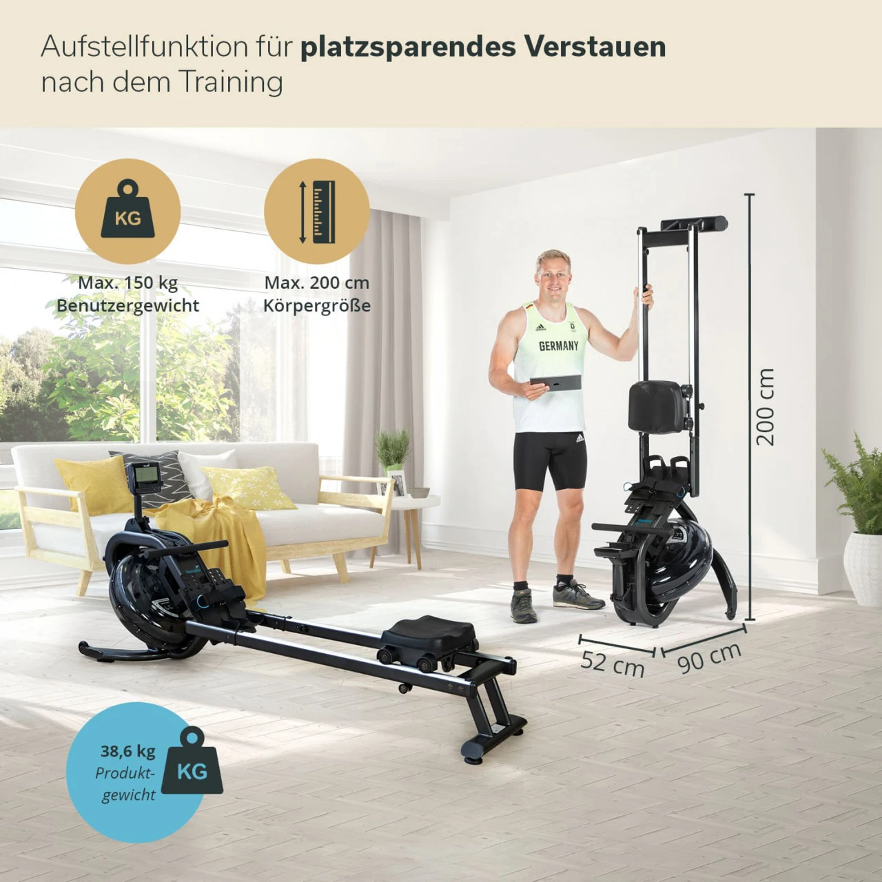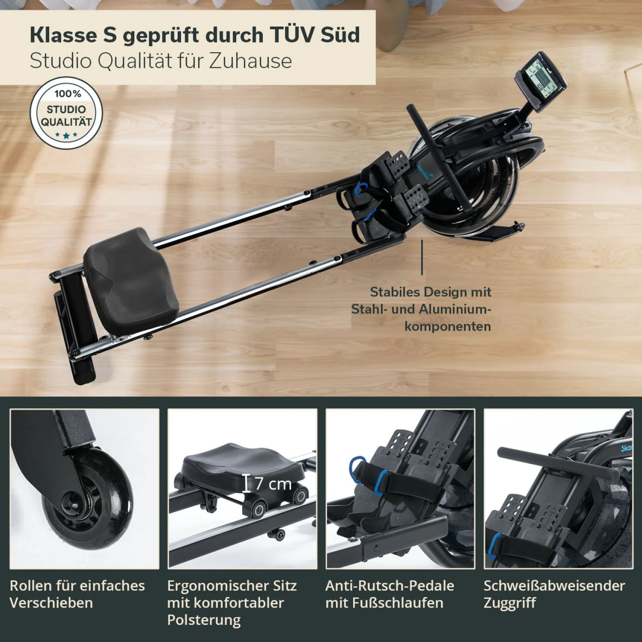 Der Widerstand für das Rudern ergibt sich zum einen durch die Wasser-Füllmenge und zum anderen durch den Kraftaufwand, der beim Ruderzug aufgebracht wird. Der Wassertank ist aus bruchsicherem Kunststoff gefertigt und fasst bis zu 14 Liter.