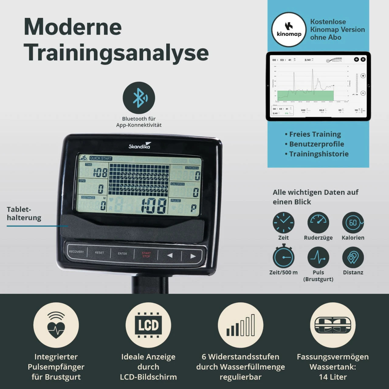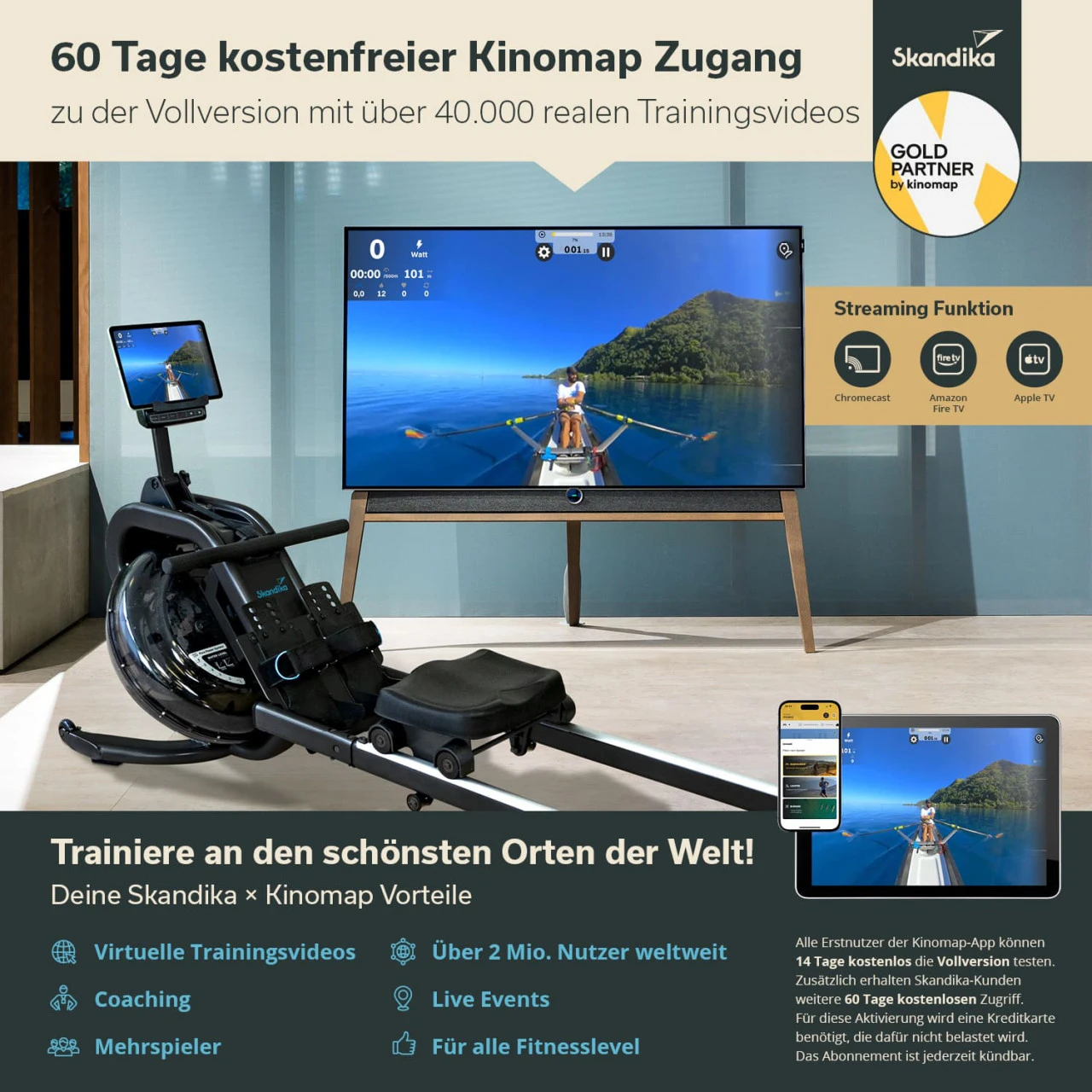 Das Nemo IV ist ein durch den TÜV Süd geprüftes, hochwertiges Wasserrudergerät in Studio Qualität. Skandika-Kunden erhalten durch die Gold-Partnerschaft mit Kinomap einen Code, um 60 Tage kostenfrei die Vollversion der Kinomap-App zu testen. Live-Videos, Coachings und virtuelle Trainingsvideos bringen jede Trainingseinheit auf ein neues Level und ermöglichen Workouts an den schönsten Orten der Welt.