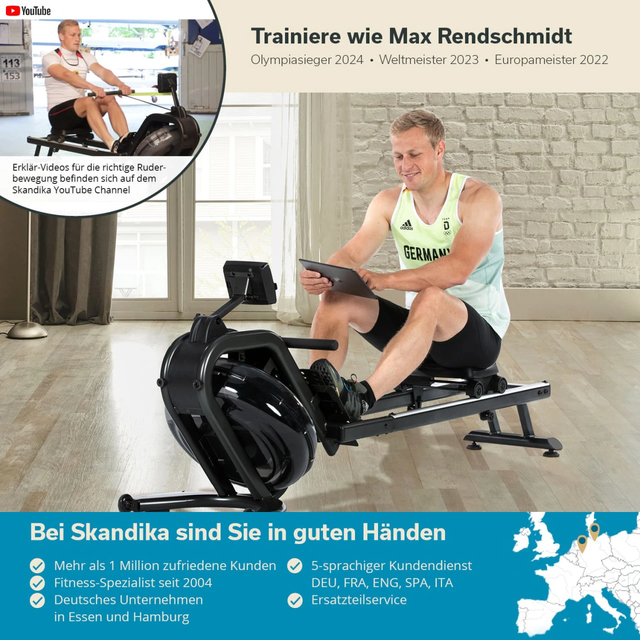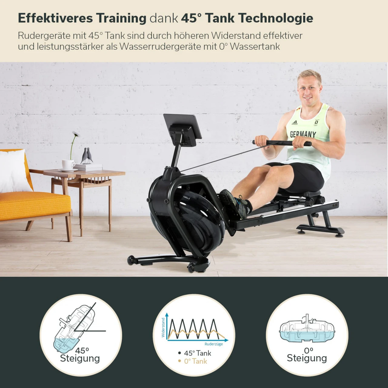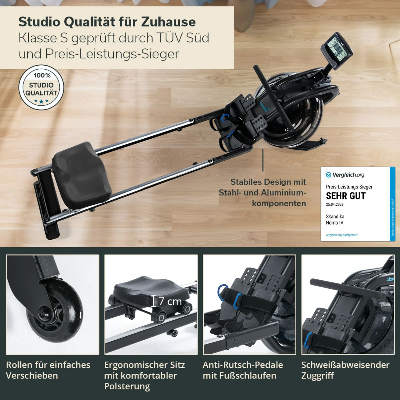 Das Nemo IV Rudergerät mit Wasserwiderstand hat Studioqualität geprüft durch den TÜV Süd. Es handelt sich also um ein Trainingsgerät von hoher Qualität und Langlebigkeit – der ideale Heimtrainer für ein effektives Training zu Hause.