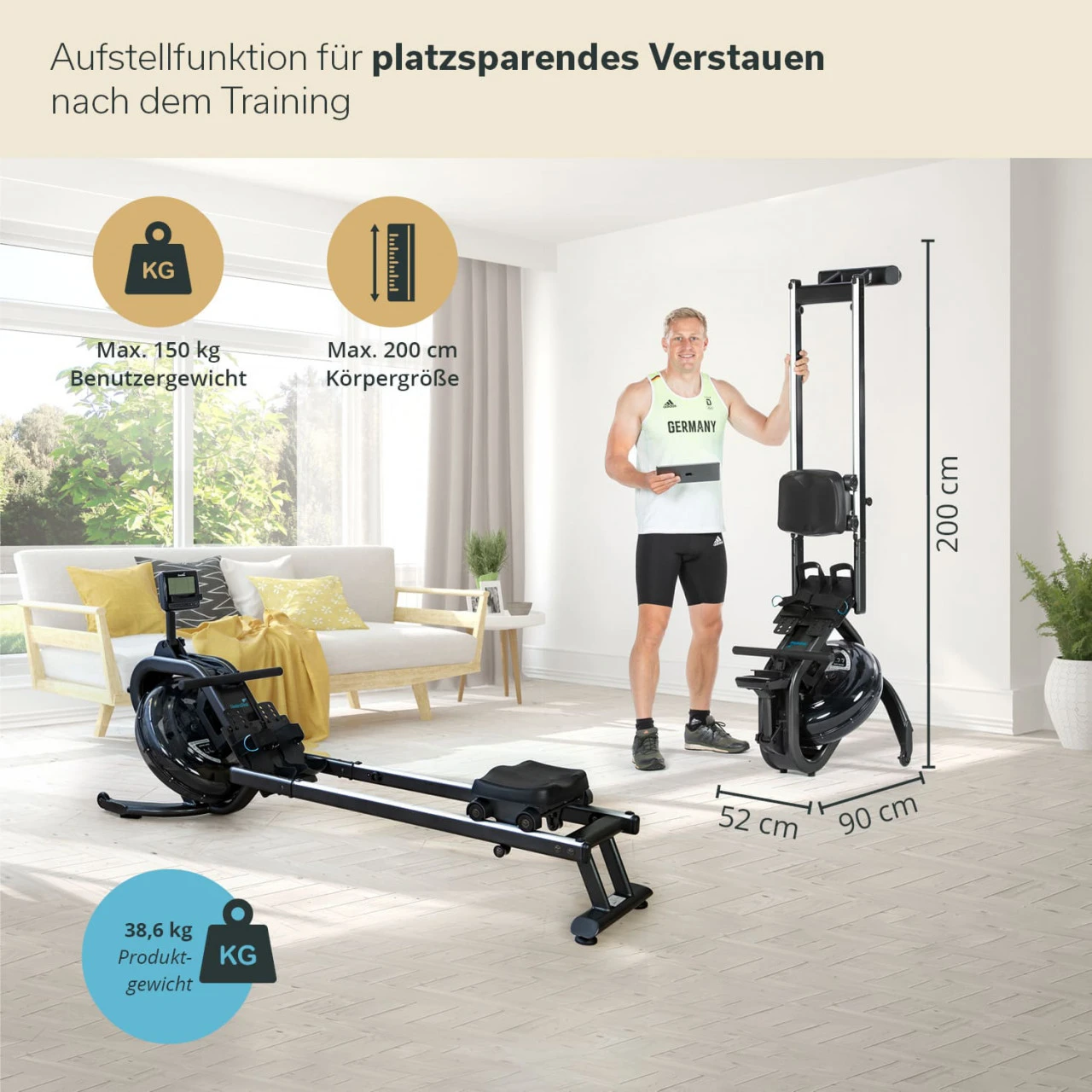 Der Widerstand ergibt sich zum einen durch die Wasser-Füllmenge und zum anderen durch den Kraftaufwand, der beim Ruderzug aufgebracht wird. Der Wassertank ist aus bruchsicherem Kunststoff gefertigt und fasst bis zu 14 Liter.