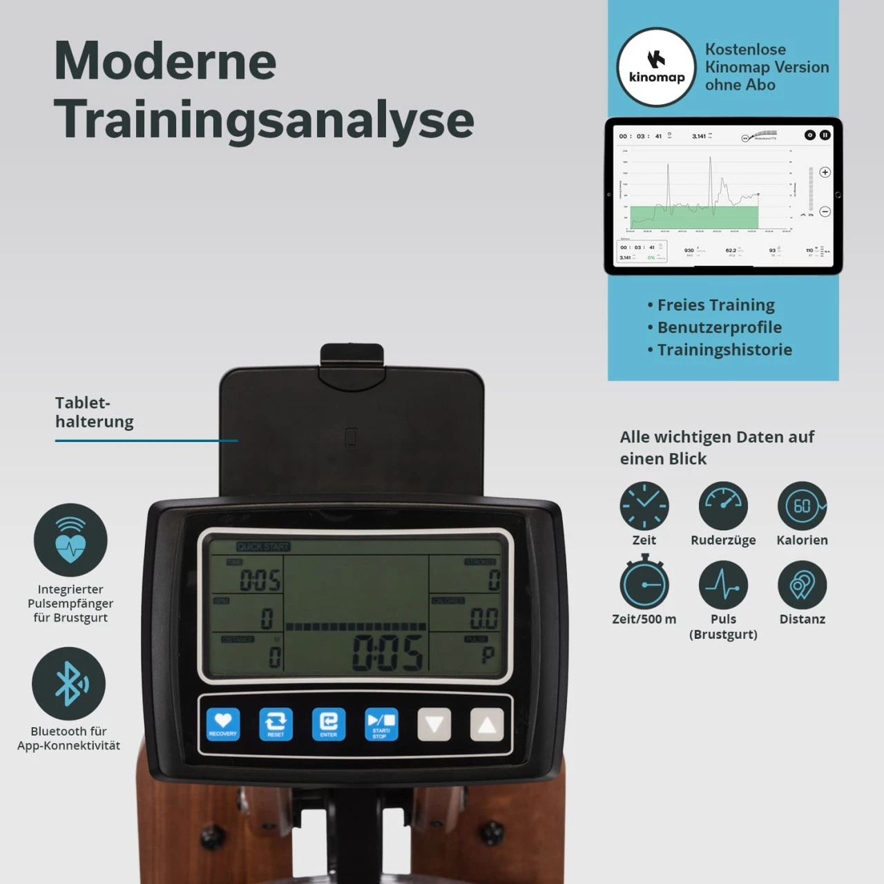 Der innovative Trainingscomputer mit großem LCD-Display ist leicht zu bedienen und zeigt alle wichtigen Trainingsdaten an, wie Anzahl der Schläge, Schläge pro Minute, Entfernung, Kalorien, Zeit und Zeit pro 500 m. Der integrierte Empfänger für optional erhältliche Brustgurte (5,3 kHz) ermöglicht auch die Anzeige des Pulses.